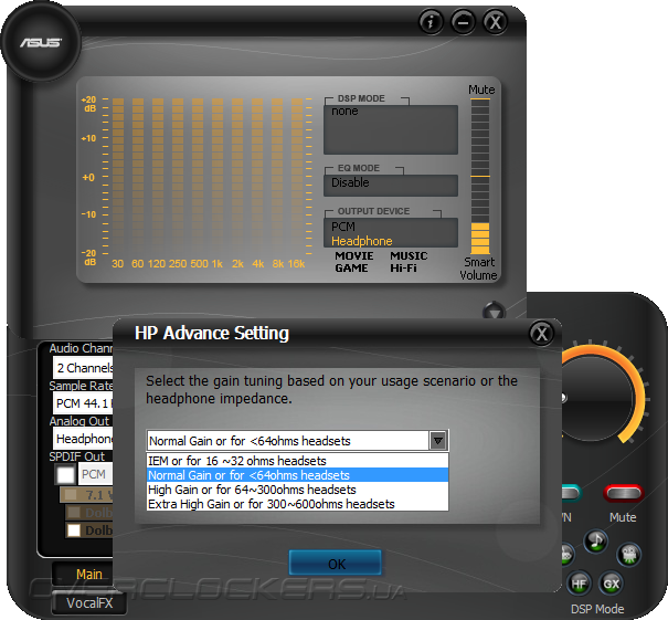 После нажатия на копку под индикатором уровня сигнала открывается панель с дополнительными настройками, где на вкладке Main выбирается количество каналов для вывода звука, калибруется сигнал в зависимости от расположения акустических систем, задается частота дискретизации, а также настраивается режим работы выхода SPDI/F. В том случае, если в качестве источника звука используются стереонаушники, пользователи могут отрегулировать коэффициент усиления в зависимости от внутреннего импеданса гарнитуры.