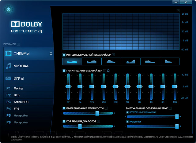 Несмотря на неказистый внешний вид и не самый удобный по современным меркам интерфейс утилита Audio Center показала себя с наилучшей стороны в плане стабильности работы, а большего от нее и не требуется. Помимо того новинка комплектуется программным продуктом Dolby Home Theater 4, который служит для оптимизации параметров воспроизведения в зависимости от сценария использования. Программа предлагает три основных режима работы: «Фильмы», «Музыка» и «Игры», причем, в последнем случае есть ряд подрежимов в зависимости от жанра видеоигры.