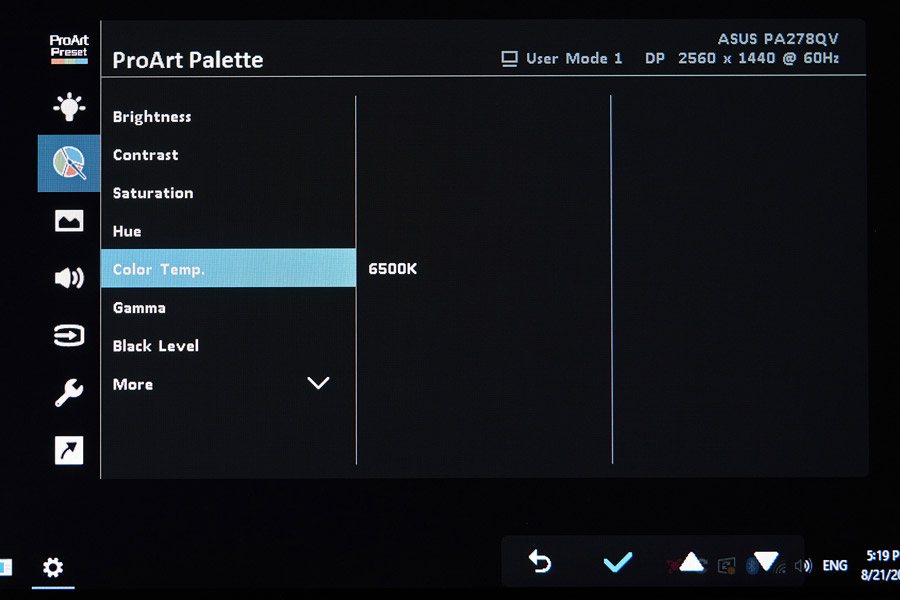 В ProArt Palette собраны все самые важные настройки: шестиосевая настройка баланса белого (RGB+CMY), контрастности, уровня черного, цветовой температуры, гаммы и многого другого, что может потребоваться профессиональному калибровщику.