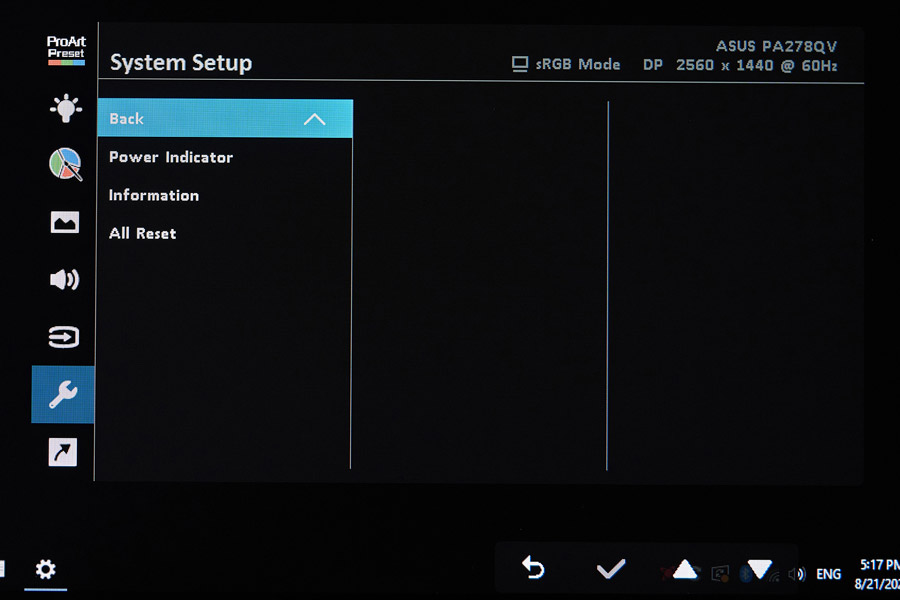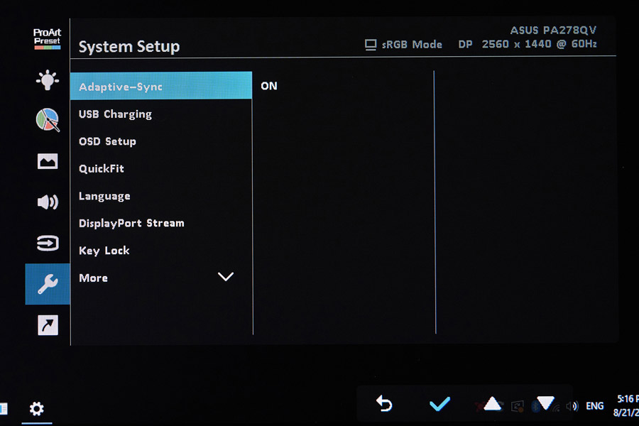 Замыкает этот список System Setup, где вы можете выбрать язык меню, включить возможность зарядки устройств через USB или включить адаптивную синхронизацию. В случае с нашей моделью диапазон ее работы равен 46–75 Гц.