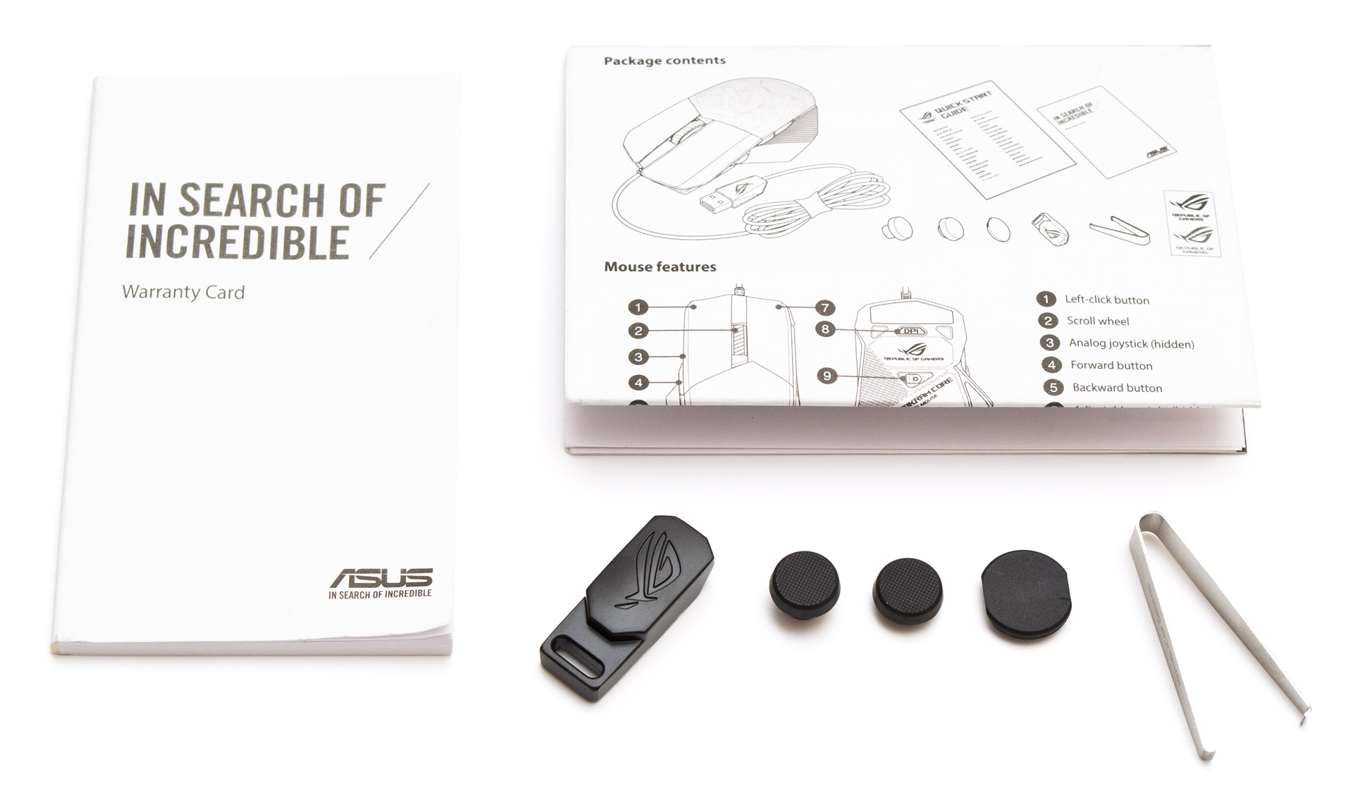 Комплект поставки тоже поредел. Исчезло множество ненужных, но приятных аксессуаров. Остались лишь инструкция, брошюра с информацией о гарантии, съемный грузик, длинная и короткая накладки на джойстик и заглушка для него, пинцет для съема механизмов переключателей. Теоретически здесь еще должны бы быть две наклейки ROG, но по факту в комплекте их обнаружено не было.