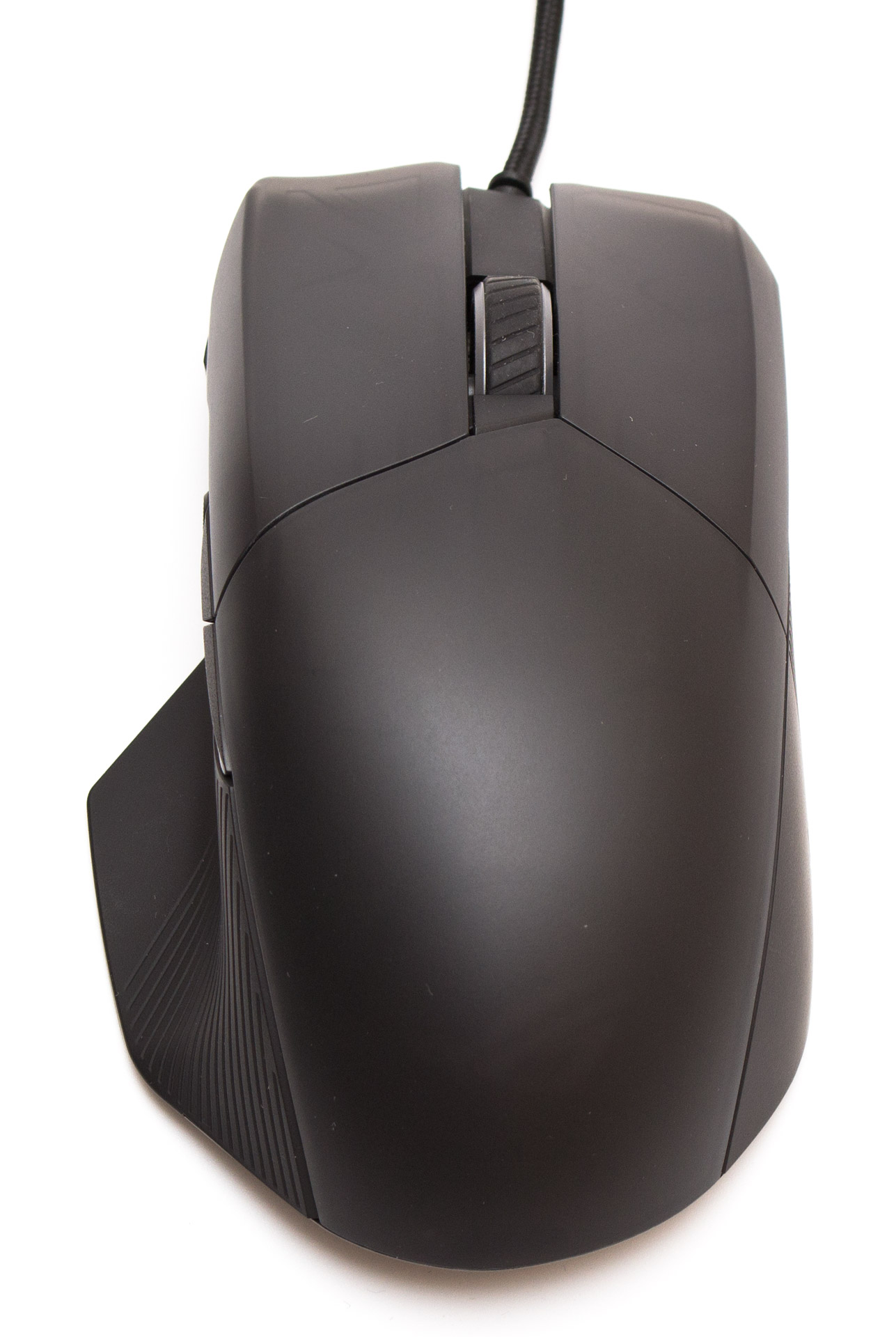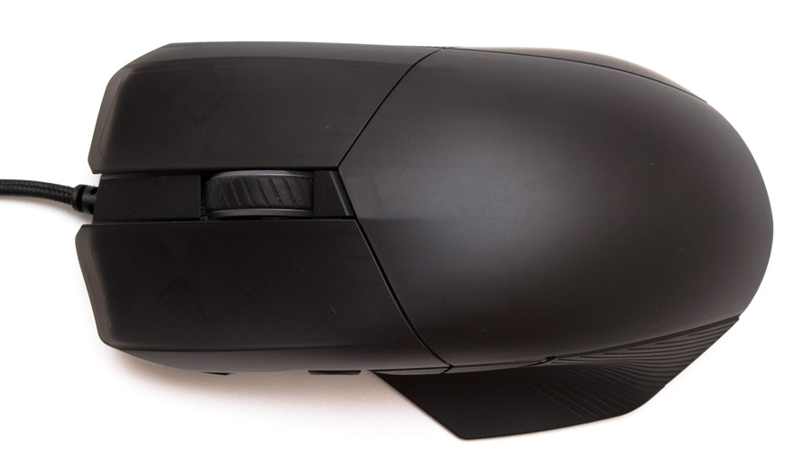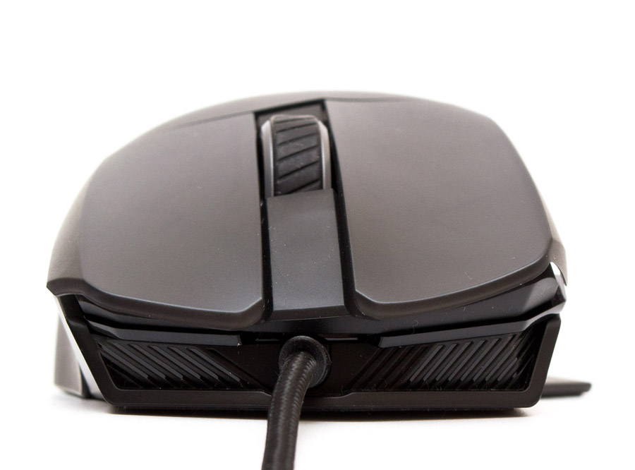Кабель у мыши стал несъемным. Он заходит в корпус в нижней центральной части и оснащен короткой защитой от перегиба. Передние полоски светодиодов, к счастью, убрали из данной модели. Колесо прокрутки внешне выглядит так же, как и раньше, но в нем явно сменился энкодер, судя по тактильным ощущениям. Повороты теперь происходят с хорошо различимым треском, позиции фиксации стали более жесткими и появился люфт в правую сторону. Нажатие средней кнопки происходит легко и с громким щелчком.