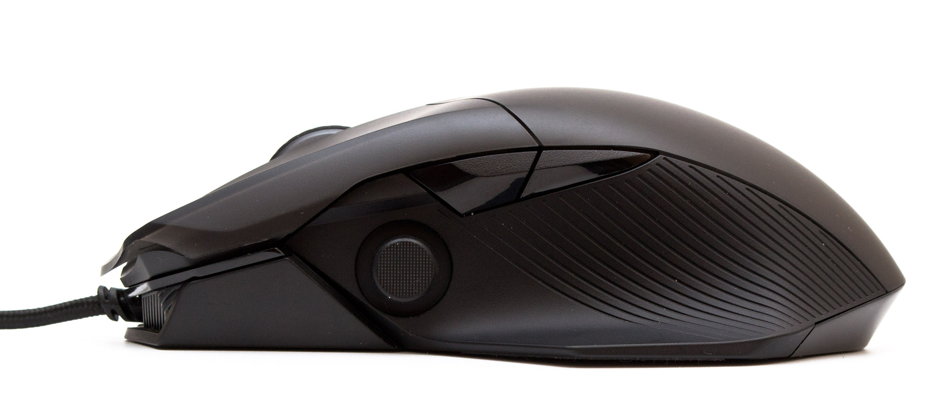 Боковина выполнена из цепкого матового пластика, покрытого диагональными канавками в задней части. Вставка спереди, за джойстиком, из металлической стала пластиковой. Две дополнительные кнопки имеют треугольную в профиль форму разного размера. Легко нащупываются и нажимаются прямо или скользящим движением снизу вверх. Щелчок у клавиш очень легкий и тихий. Внизу есть крупная и удобная платформа под большой палец.
