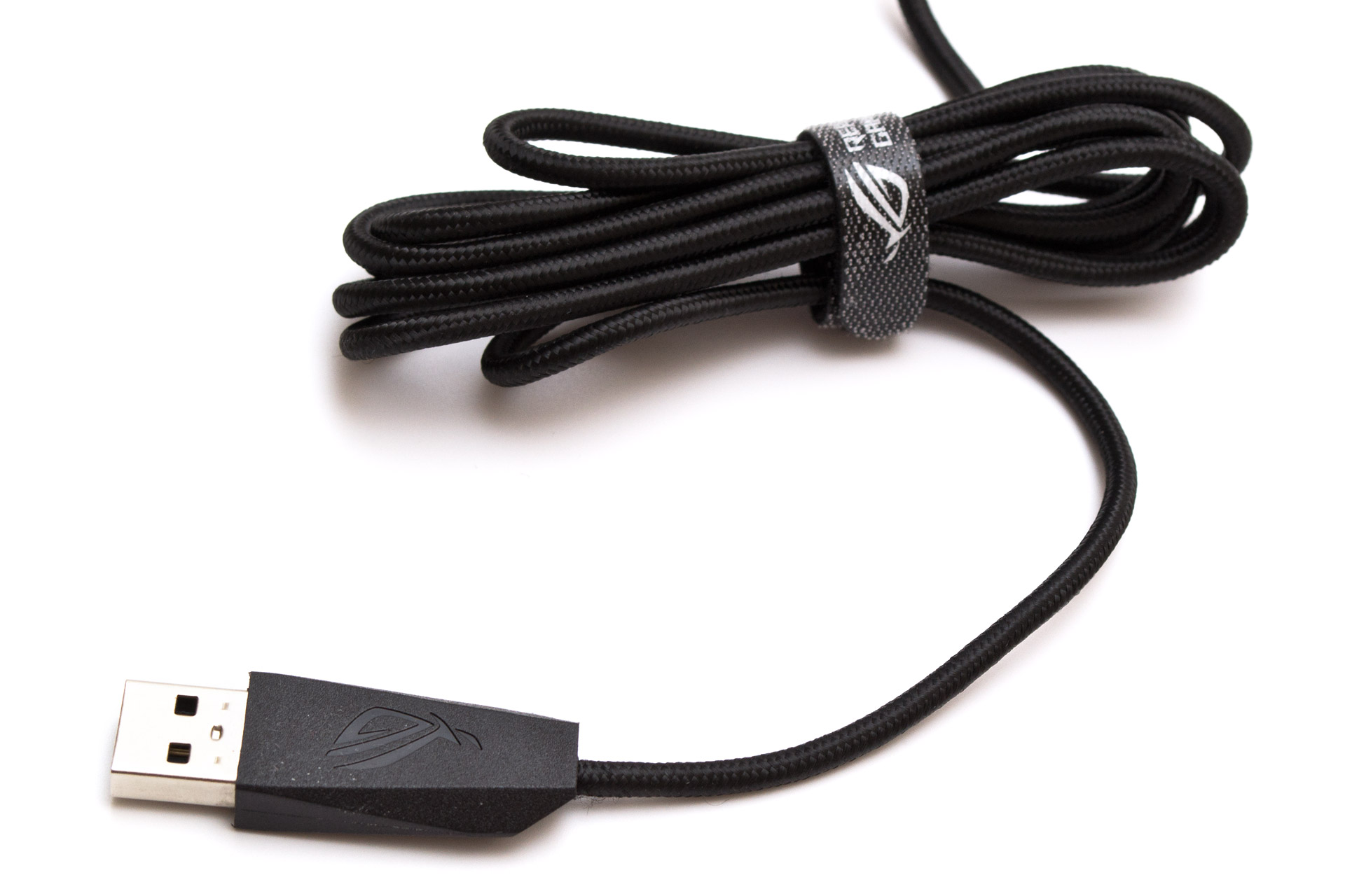 Покрытый нейлоновой оплеткой кабель у мыши средний по толщине и гибкости. Он способен хорошо запоминать заданную форму. Ферритового фильтра на нем нет, зато есть липучая лента с логотипом, позволяющая смотать лишнюю длину.