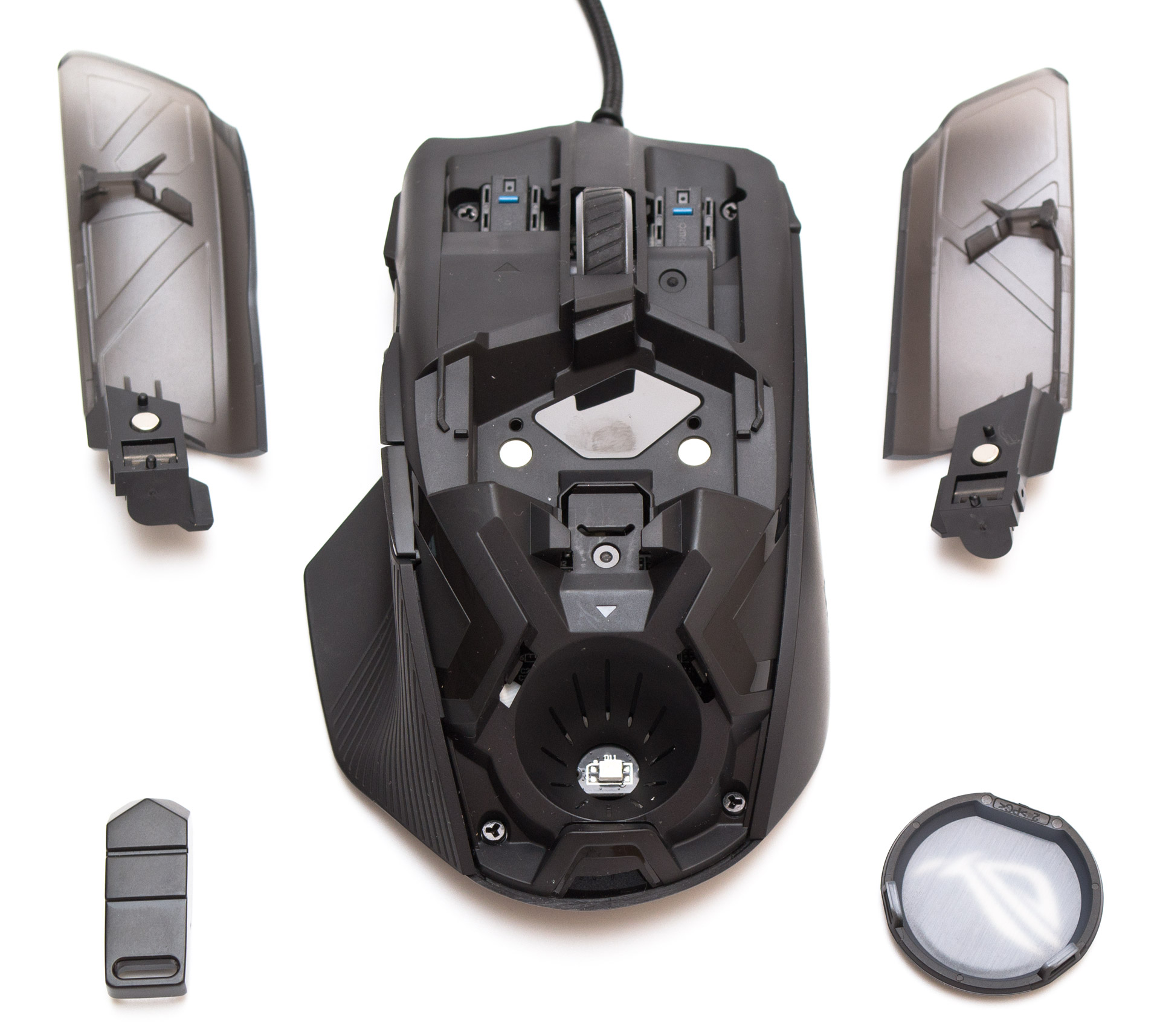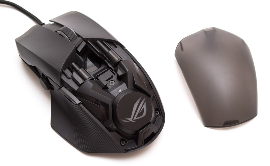 Логотип по-прежнему можно снять, хотя сменной пластинки в комплекте больше нет. Место крепления приемника занял съемный 13,6-граммовый грузик, который при установке увеличивает вес мыши до 111 грамм.