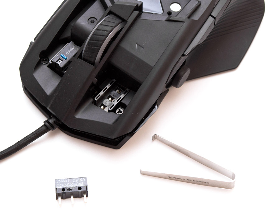 Для извлечения механизмов можно использовать комплектный брендированный пинцет. Как и ранее, здесь стоят переключатели Omron D2FC-F-K(50M) с ресурсом наработки на отказ в 50 млн. нажатий и синими ударниками. Их можно легко заменить совместимыми моделями переключателей в случае выхода из строя или если требуются другие тактильные ощущения от нажатий.