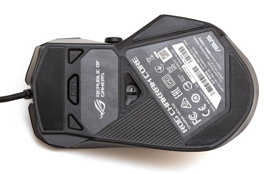 На основании мыши есть три крупные тефлоновые ножки, расположенные на передней, задней и боковой гранях. Трапециевидный переключатель разрешения почему-то расположен спереди, возле глайда. От треугольных кнопок по бокам остались лишь впадины. Оптический сенсор PixArt PAW3335 с инфракрасной подсветкой расположен по центру и развернут поперечно относительно корпуса мыши.