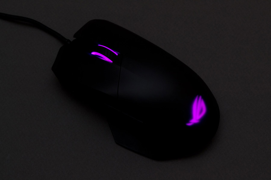 ROG Chakram Core имеет две классические зоны подсветки — колесо прокрутки и логотип на задней панели. Логотип выглядит слегка смазанным, если смотреть под углом, из-за полупрозрачного пластика на спинке мыши. Все цвета передаются корректно, в том числе и белый.
