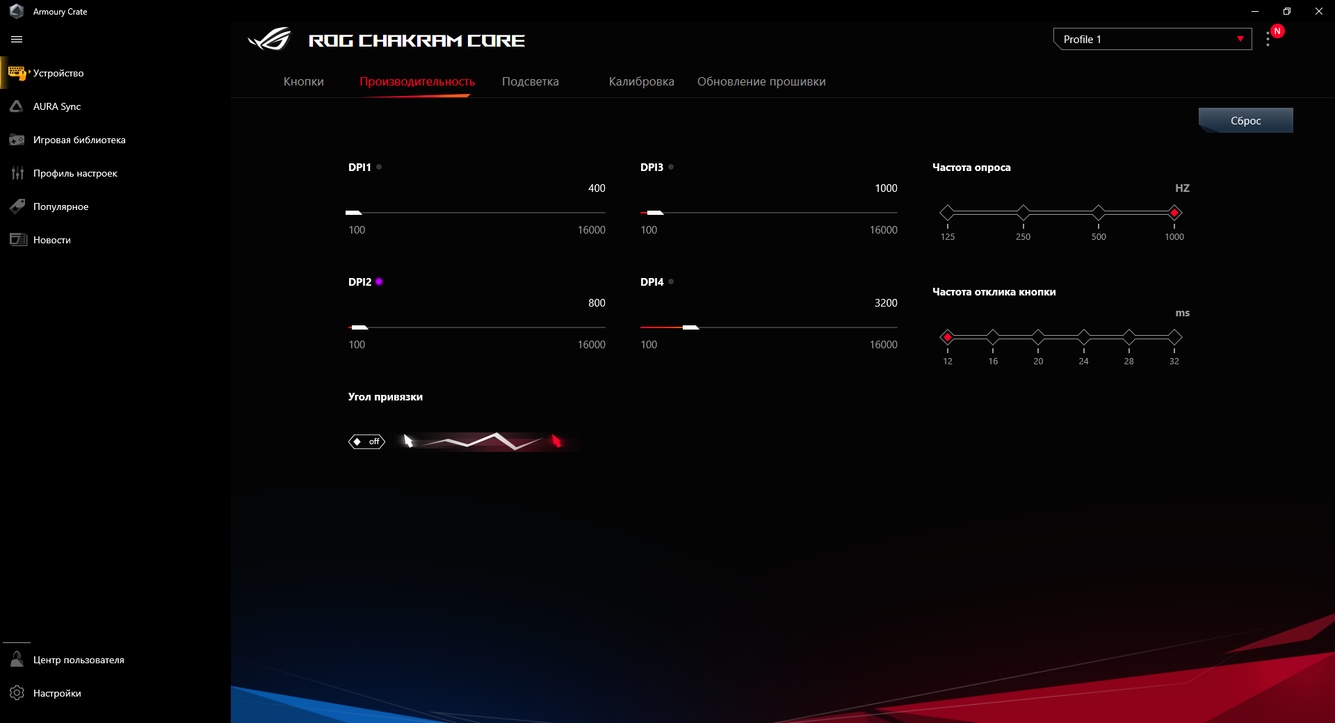 ASUS ROG Chakram Core имеет три бортовых профиля памяти, которые позволяют раздельно сохранять настройки сенсора, переназначенные команды всех кнопок и параметры подсветки. Переключение профилей производится нажатием кнопки DPI на основании мыши в сочетании со средней (третий профиль), передней боковой (второй профиль) или задней боковой клавишей (первый профиль). Последовательное нажатие кнопки DPI переключает четыре предустановленных уровня разрешения. Удержание кнопки DPI и вращение колеса прокрутки позволяет бесступенчато изменять разрешение.