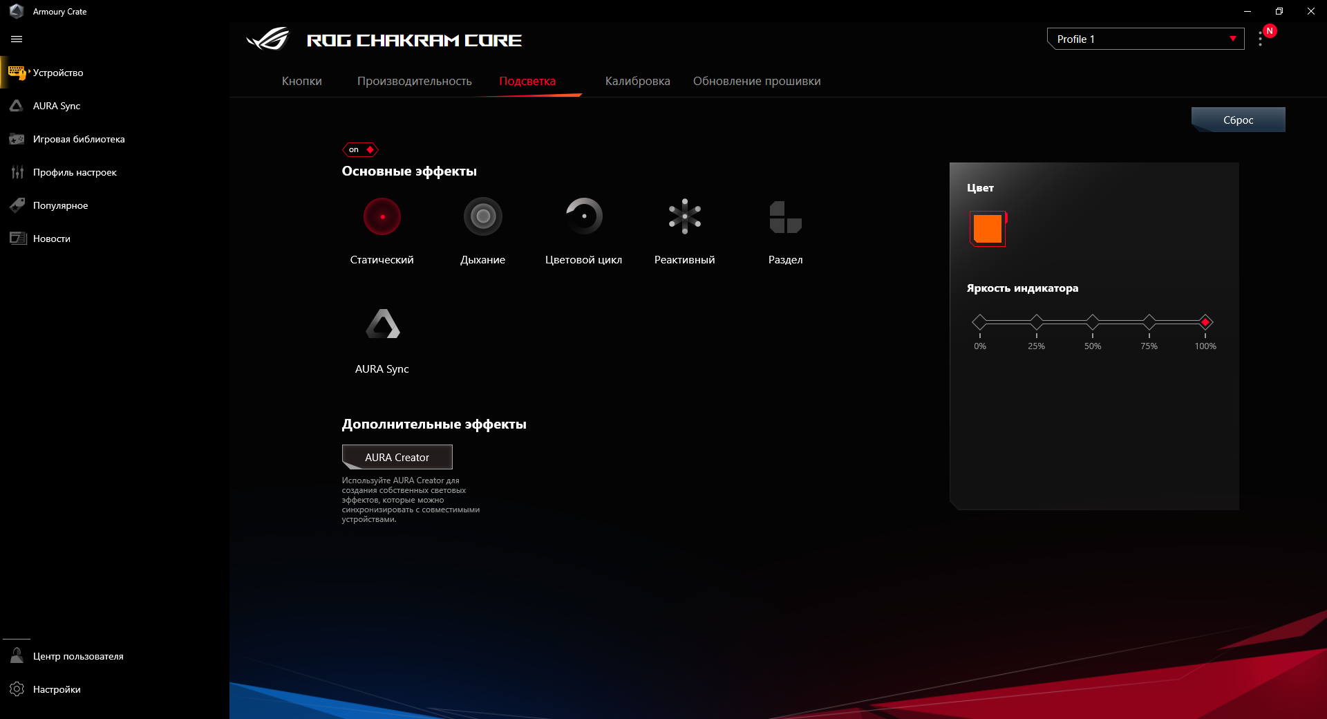 На экране настройки подсветки можно выбрать четыре варианта световых эффектов, настроить для них любой цвет и пять уровней яркости. Отдельно доступна раздельная настройка светодиодов колеса прокрутки и логотипа. А с помощью Aura Creator можно создать дополнительные эффекты.