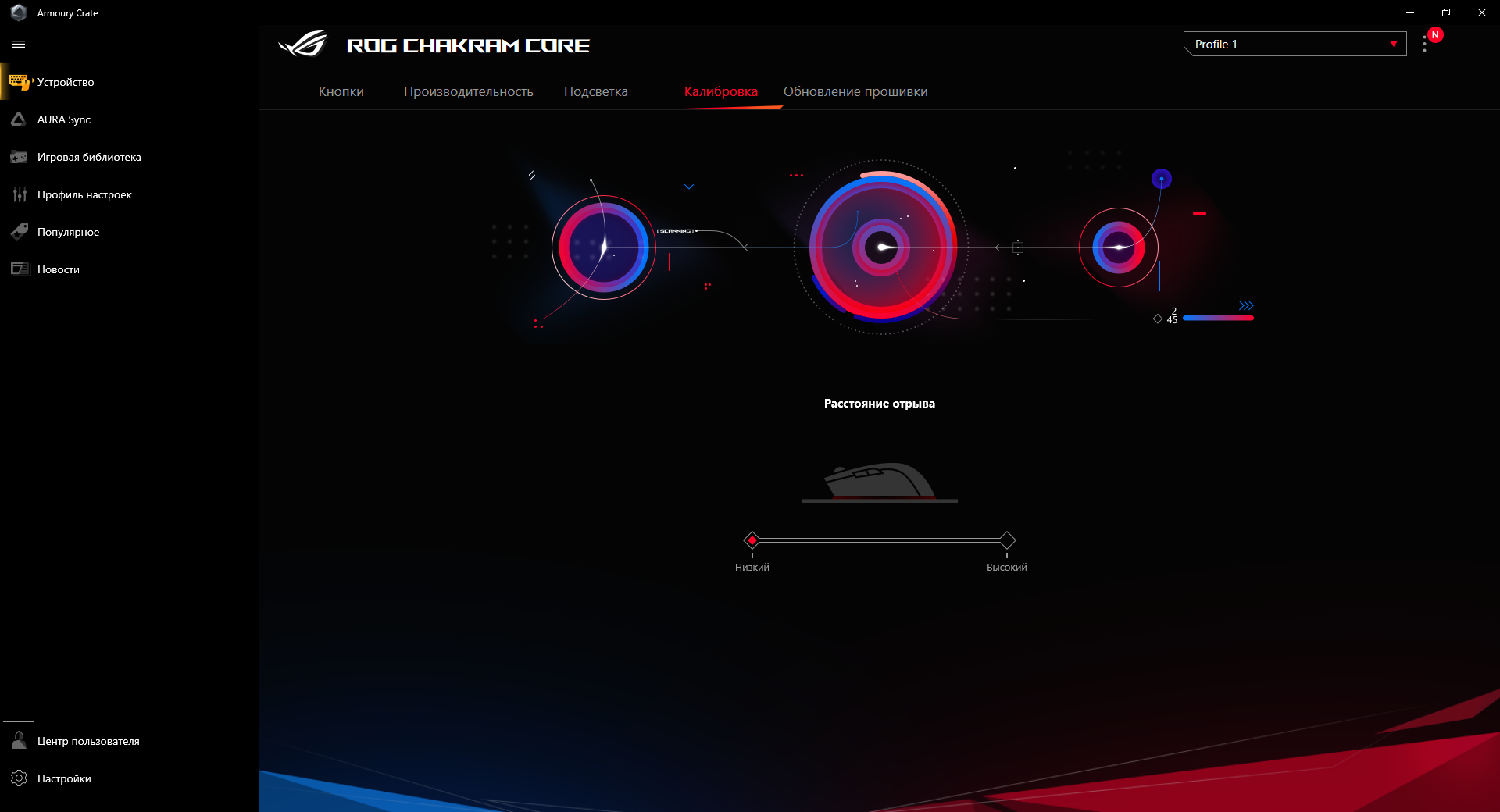 В разделе «Калибровка» доступна настройка высоты отрыва мыши от поверхности. Два варианта — низкий и высокий. Первый соответствует 1 мм, а второй — 2 мм.