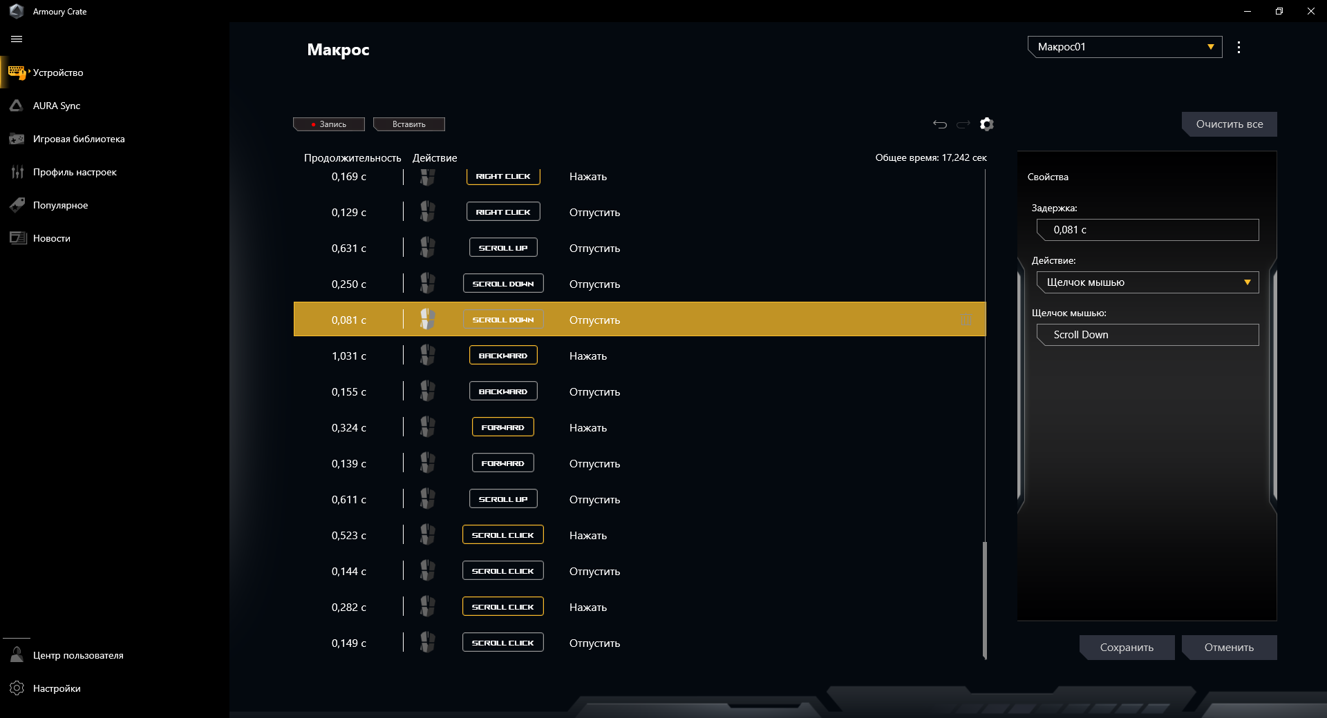 Редактор макросов позволяет записывать команды с мыши и клавиатуры, в том числе направления колеса прокрутки. Траектория движения курсора не фиксируется. В одну макрокоманду помещается до 200 команд, каждая из которых состоит из времени задержки, нажатия и отпускания клавиши. Все задержки записи и воспроизведения, последовательность и содержание команд можно легко отредактировать по окончанию записи.