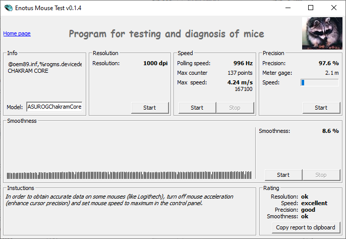 Компания не стала слишком сильно напрягаться с сенсором и оставила в ROG Chakram Core все тот же PixArt PAW3335, что и в беспроводном Chakram. Юмор в данной ситуации в том, что этот датчик заточен именно на работу без провода и основное его преимущество состоит в низком энергопотреблении. Другими словами, классический PMW3360 или 3389 здесь бы смотрелся более уместно. Нет, в целом сам по себе PAW3335 неплох, поскольку хорошо отслеживает поверхность, не срывается, имеет высокую допустимую скорость движения и почти лишен паразитных моментов в своей работе. И даже уровень сглаживания при работе по проводу стал гораздо более приемлемым. Но он не так идеален, как 3389 и последующие его итерации.