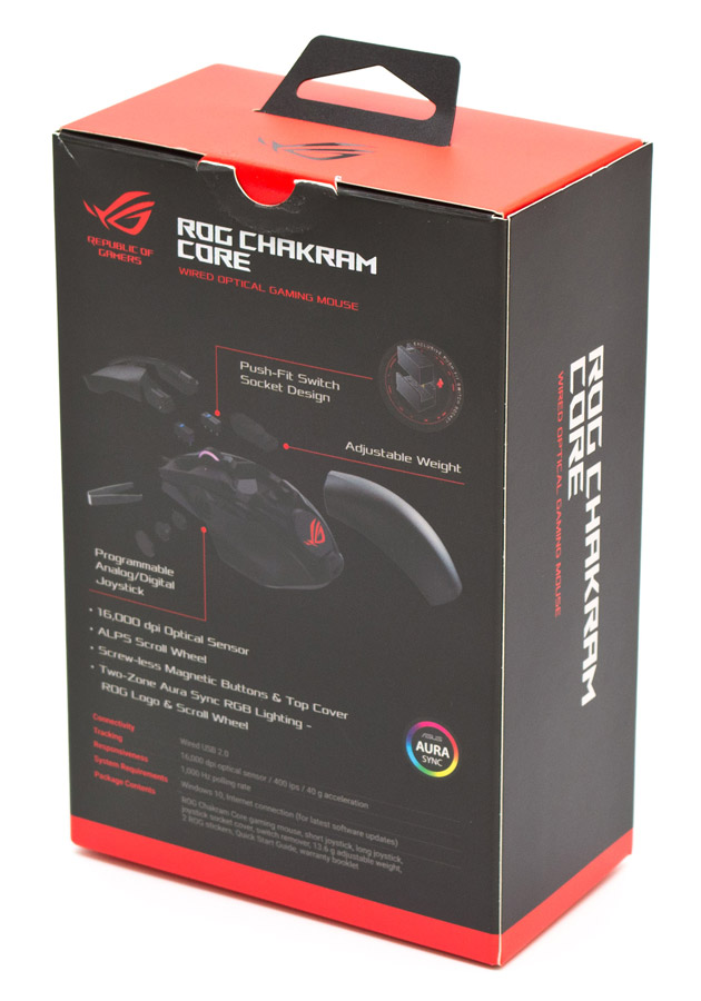 В сравнении со старшей беспроводной моделью, упаковка ASUS ROG Chakram Core стала намного более простой и уменьшилась в размерах. Теперь это обычная коробка, выполненная в фирменных цветах и покрытая необходимыми фотографиями, информацией о достоинствах продукта и некоторых его технических характеристиках. Внутри же осталась лишь простая пластиковая форма с картонными вкладышами, на которых все и держится.