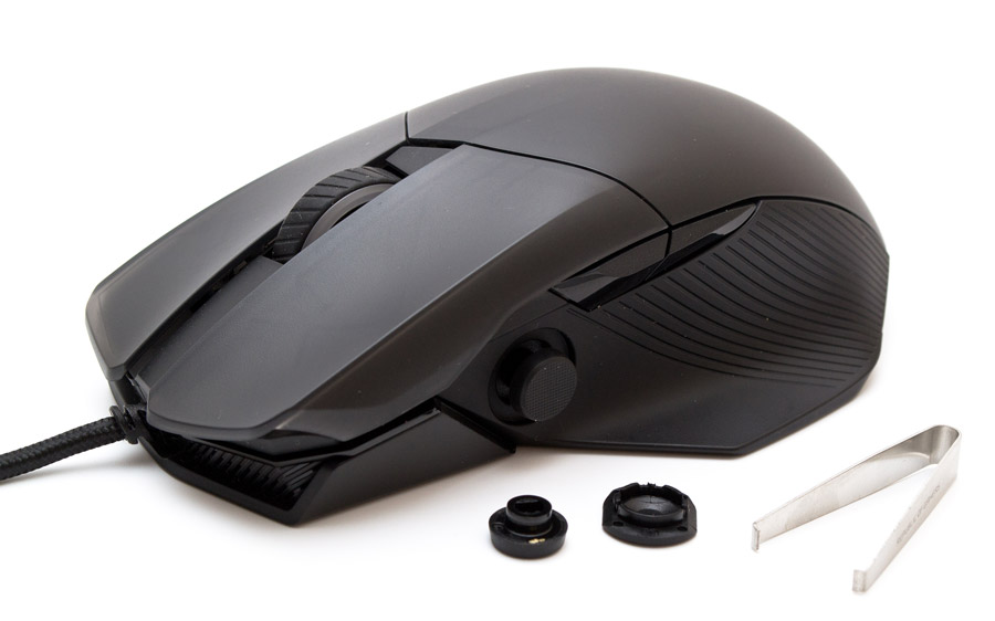 Комплект поставки тоже поредел. Исчезло множество ненужных, но приятных аксессуаров. Остались лишь инструкция, брошюра с информацией о гарантии, съемный грузик, длинная и короткая накладки на джойстик и заглушка для него, пинцет для съема механизмов переключателей. Теоретически здесь еще должны бы быть две наклейки ROG, но по факту в комплекте их обнаружено не было.