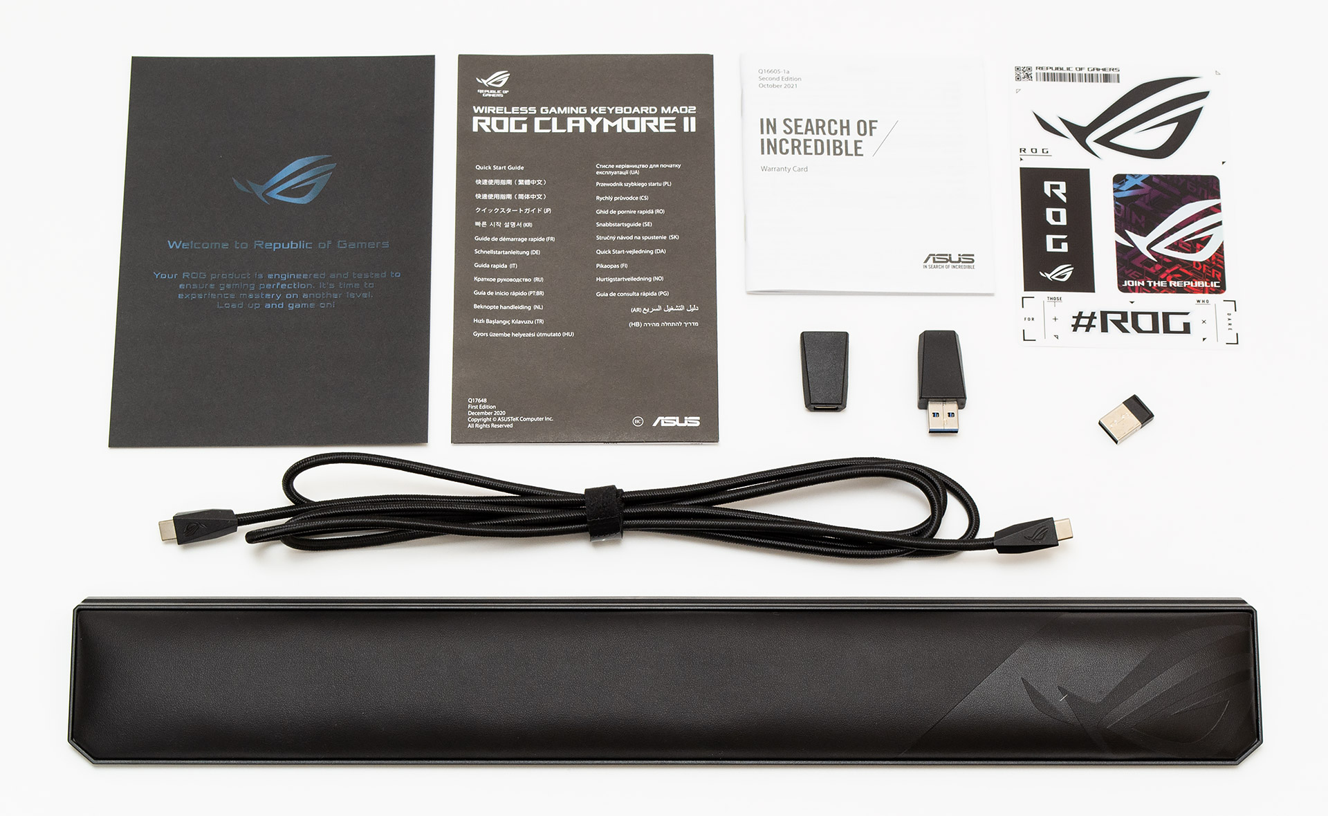 В комплекте, кроме клавиатуры и цифрового блока, есть подставка под ладони, сигнальный кабель USB Type-C, переходник с USB Type-C (мама) на USB Type A (мама), переходник с USB Type-C (мама) на USB Type A (папа), миниатюрный 2,4-ГГц приемник, письмо с поздравлением, инструкция, брошюра с информацией по гарантийным обязательствам и наклейки с логотипами ROG.