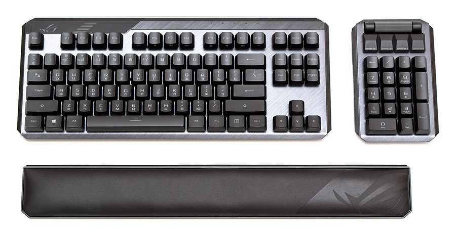 ASUS ROG Claymore II является модульным устройством и состоит из двух отдельных частей — самой клавиатуры TKL формата и цифрового блока, который можно подключить как с правой, так и с левой стороны. Кроме того, в комплекте появилась мягкая полноформатная подставка под ладони. Рассмотрим их поочередно.