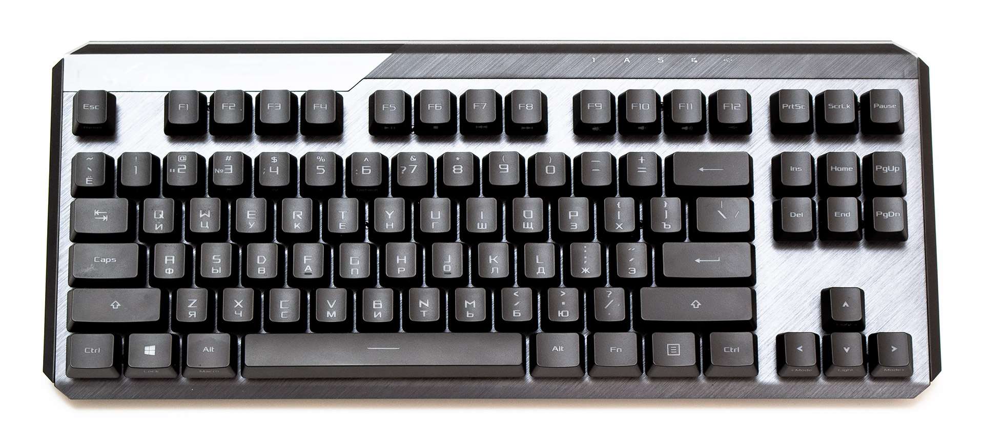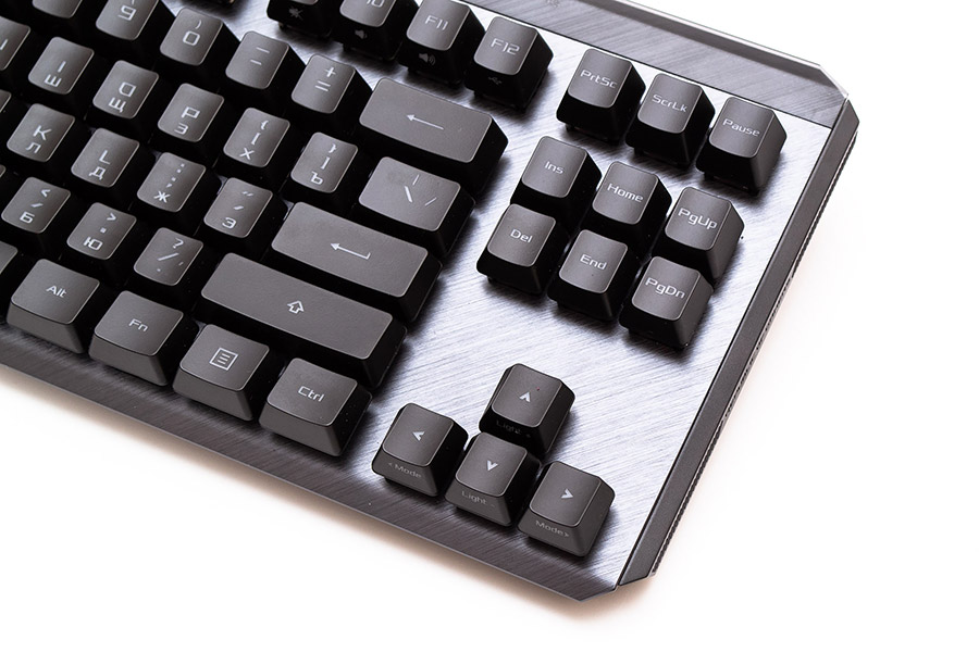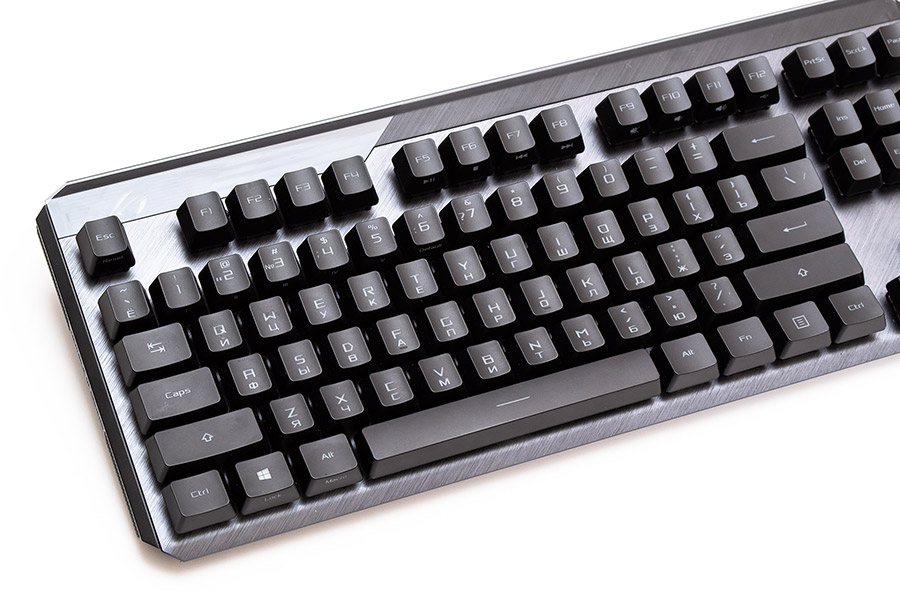Раскладка клавиш полностью соответствует стандарту ANSI с длинными однорядными кнопками Shift и Enter. Клавиша F1 находится ровно под цифрой 2. Буквы латиницы выгравированы лазером ровно по центру колпачков толстым шрифтом. Более тонкая кириллица нанесена тем же способом по центру ниже. Все надписи отлично видны, когда включена подсветка, но без нее они видны только при ярком наружном освещении. Кнопка Fn занимает место правой клавиши Win.