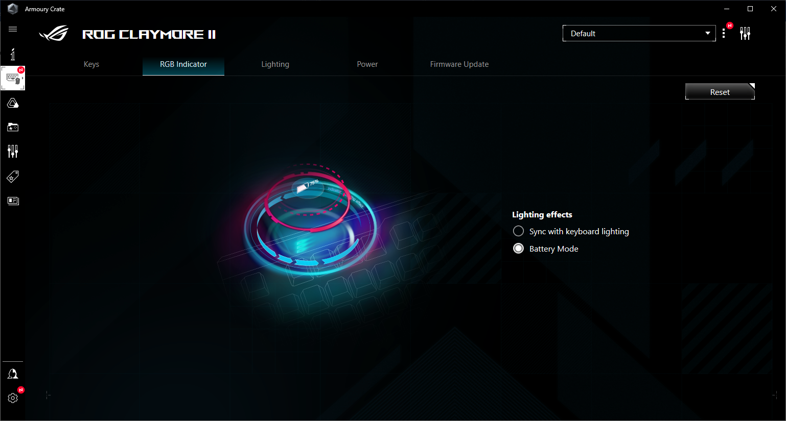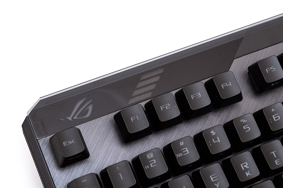 Левый верхний угол клавиатуры покрыт слоем прозрачного пластика. Под ним скрывается подсвечиваемый логотип ROG и четырехуровневый индикатор заряда батареи. Индикатору можно назначить цвет в соответствии с подсветкой клавиатуры. В зависимости от настроек он светится зеленым или синим во время работы от батареи и при медленной зарядке, или фиолетовым при быстрой зарядке.