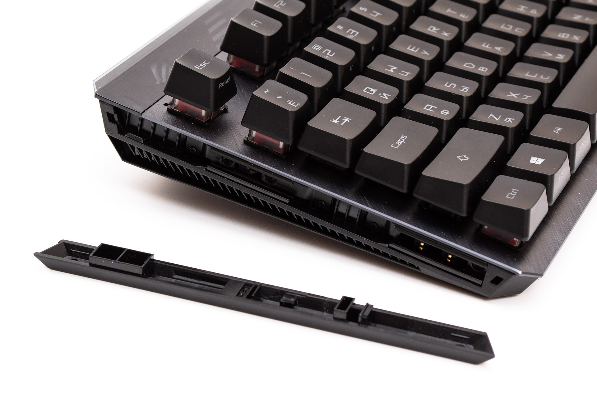 Раскладка клавиш здесь в целом стандартная и не требует привыкания. Хотя все равно нужно время на адаптацию, чтобы не попадать по цифровому блоку, когда он закреплен слева. Используемые здесь переключатели ROG RX Red предназначены именно для игр. Эти оптические механизмы очень быстры и консистентны в плане срабатывания, прекрасно стабилизированы и во многом напоминают ощущение от мембранной клавиатуры, но со всеми механическими преимуществами. Для тех, кто ищет клавиатуру для печати больших объемов текста, они могут не понравиться по тактильным ощущениям. Поэтому им лучше будет смотреть в сторону RX Blue или классических механических переключателей.