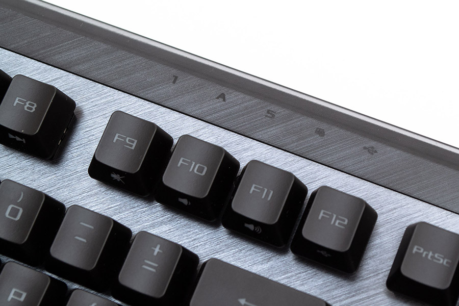 Все белые точечные индикаторы вынесены в пластиковую накладку в верхней правой части корпуса клавиатуры. Они видны только при условии активности. Надписи с обозначениями можно разглядеть только если внимательно к ним присмотреться. Последовательно, слева направо расположены: 1 (Num Lock), A (Caps Lock), S (Scroll Lock), символ Windows с замком (Win Lock) и светящийся USB, если клавиатура подключена по кабелю и включен сквозной USB порт (выключать его можно, чтобы увеличить скорость зарядки батареи).