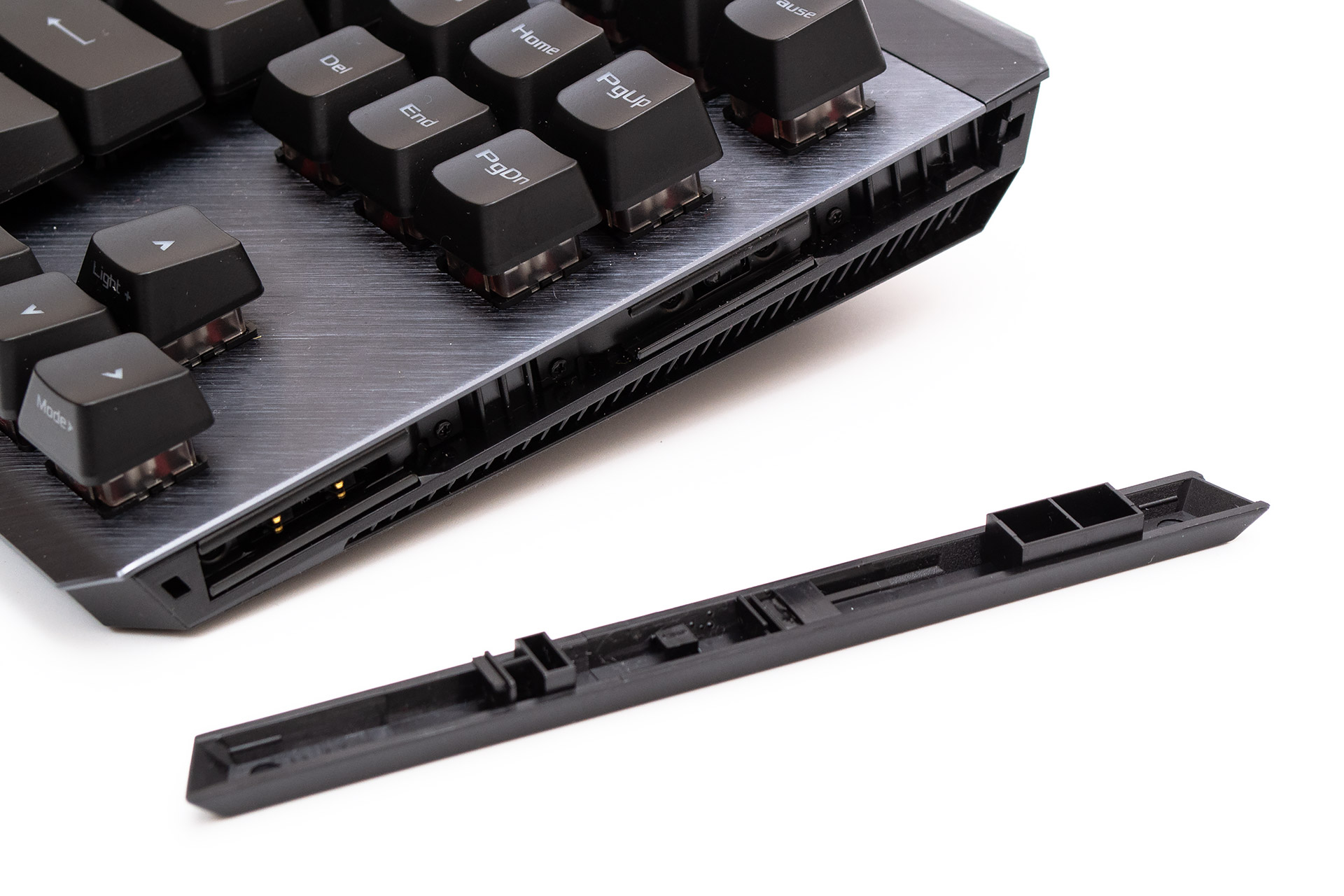 В плане общего качества ASUS ROG Claymore II проблем не испытывает. Клавиатура достаточно крепкая, как для своей модульной конструкции. Местами есть поскрипывание, но не более того. Цифровой блок клавиш закрепляется также не намертво и может немного качаться вверх или вниз, что однако вообще не мешает работе. Магнитная подставка под ладони немного уже, чем хотелось бы, но и с ней вполне удобно. За поверхность клавиатура держится хорошо, благодаря цепким ножкам из специальной резины.