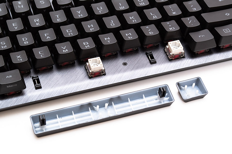 Стабилизаторы длинных кнопок здесь скрытые, с креплением клинового типа. Колпачки клавиш выполнены из крашеного ABS пластика и имеют специфическое крепление на четыре точки по углам.