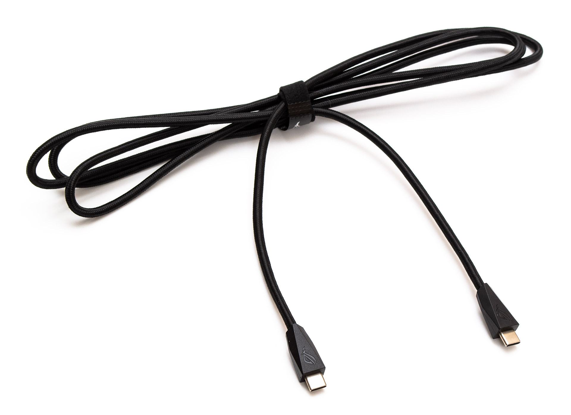 Кабель имеет разъем USB Type C с обоих концов, нейлоновую оплетку и длину в 2 метра. Он средний по толщине и уровню гибкости. Для регулировки излишней длины здесь имеется липучка типа Velcro.