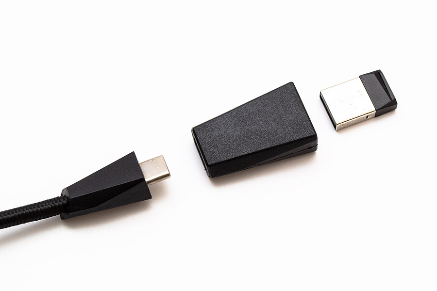 Для того чтобы уменьшить задержку сигнала, приемник можно вынести поближе к клавиатуре и подсоединить к кабелю через переходник. Удобно в случае, когда требуется подзарядка. Кабель всегда под рукой. Достаточно снять с него адаптер.