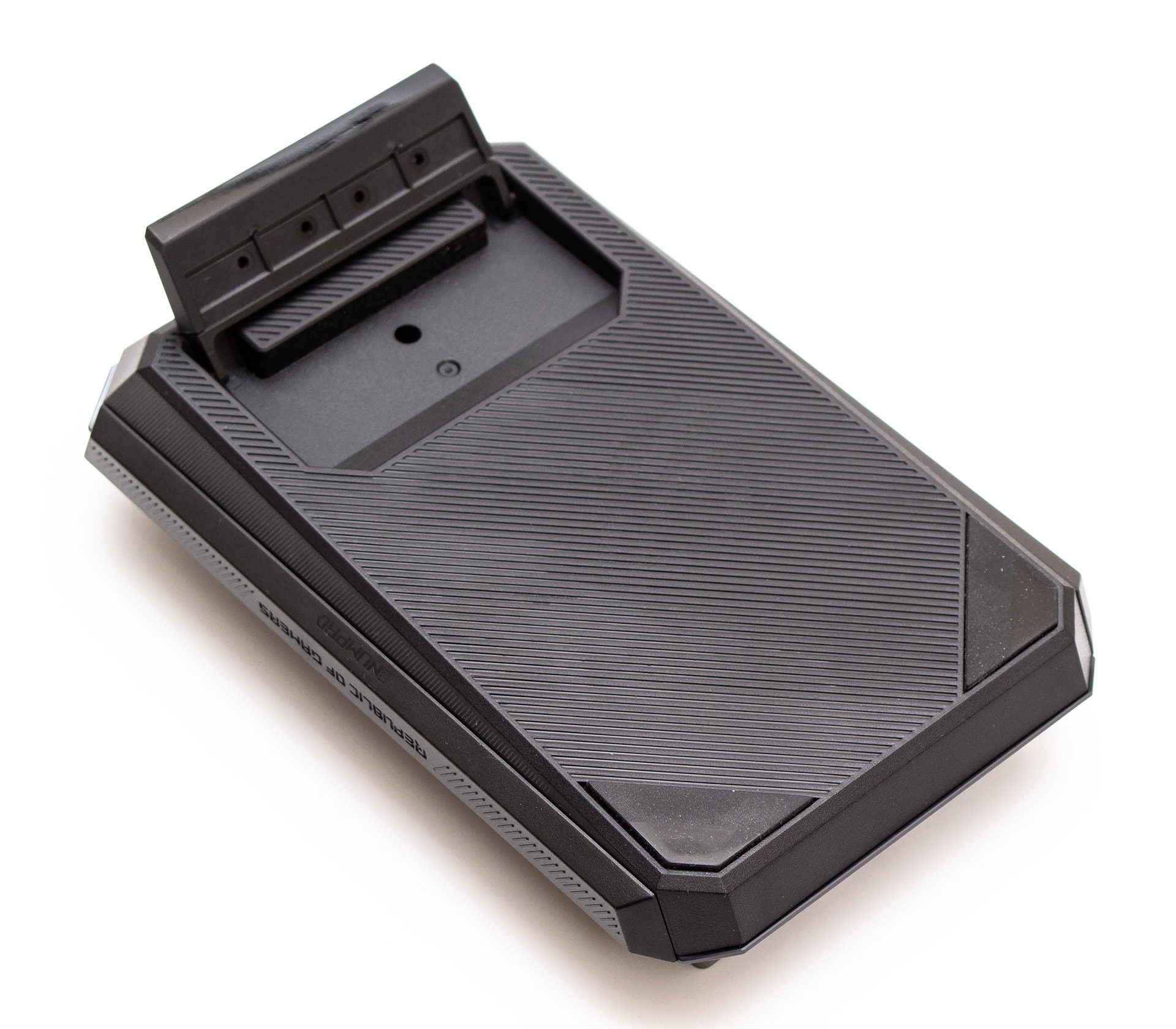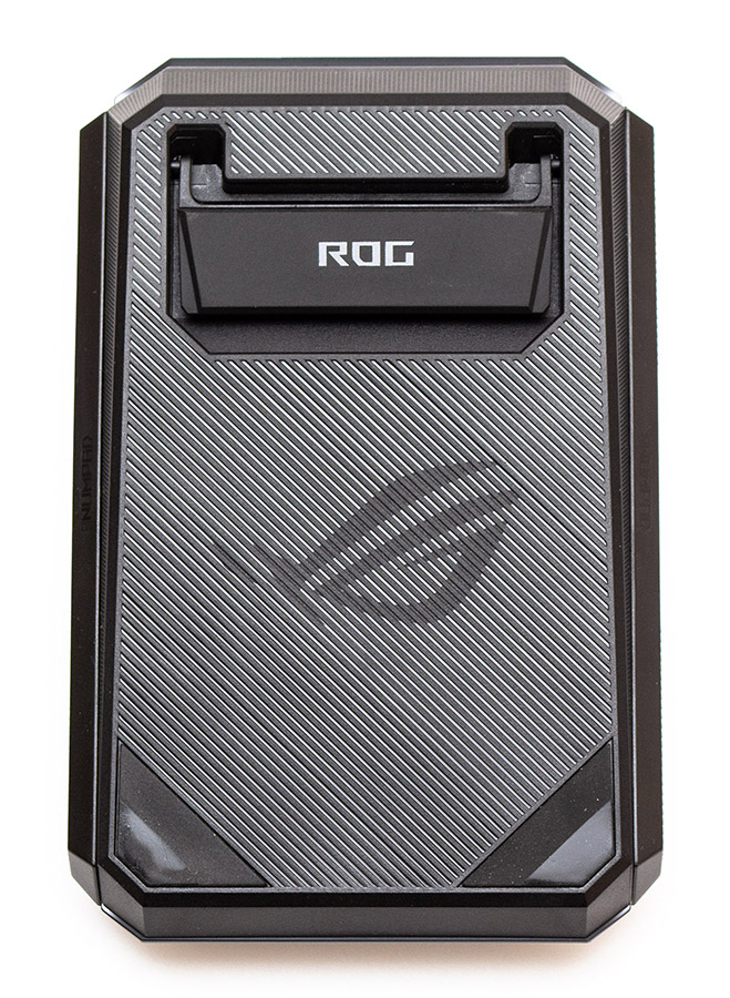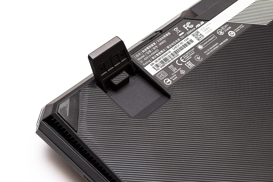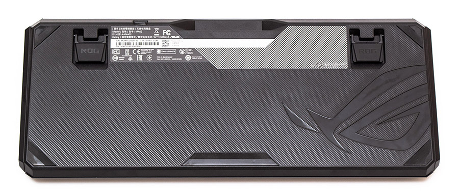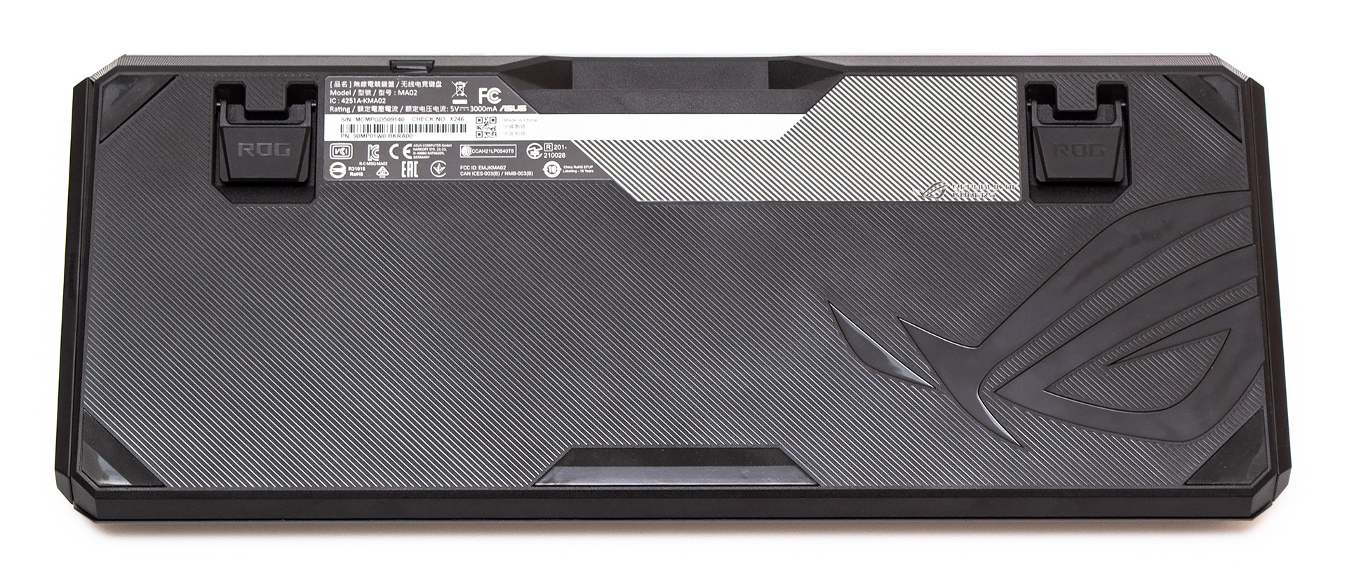 Нижняя часть клавиатуры пластиковая с диагональными полосами и логотипом ROG слева. Пять резиновых ножек имеют специальную «липкую» фактуру. Если хранить их в чистоте, то клавиатура будет держаться за глянцевый стол как приклеенная. Наклейка с серийным номером находится возле кармана приемника.