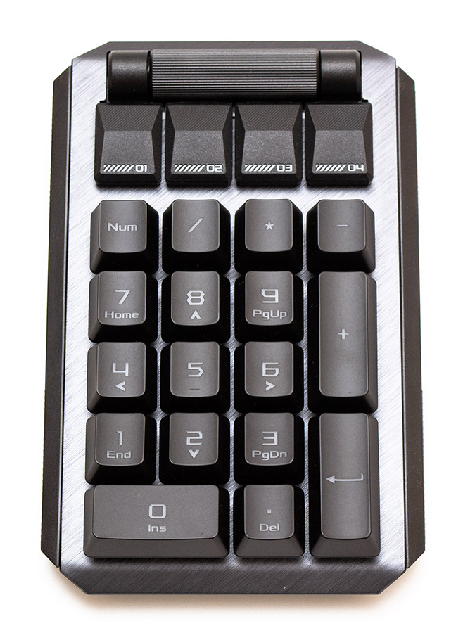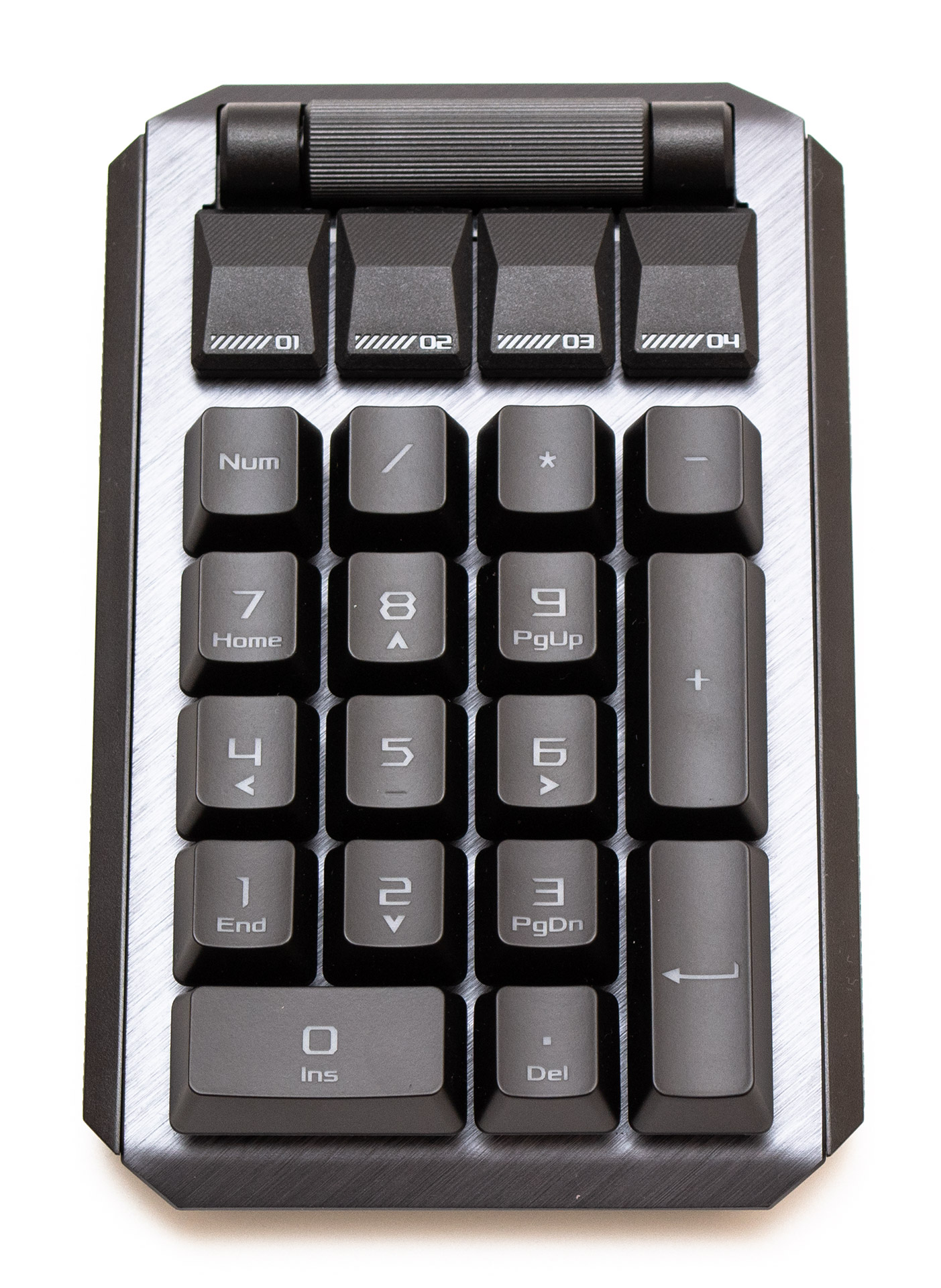Дополнительный цифровой блок имеет стандартную конфигурацию кнопок и те же переключатели, что и основная клавиатура. В верхней его части имеется большое металлическое колесо для регулировки громкости звука. Ниже встроены четыре дополнительных плоских и широких мультимедийных кнопки, которые по желанию можно перенастроить на какие-то другие команды. Габариты составляют 100х155х39 мм, вес — 214 граммов.