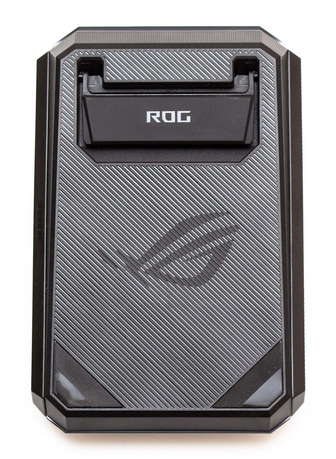 Съемная магнитная подставка под ладони имеет размер 454х70х16 мм. Сверху она покрыта мягкой искусственной кожей с тисненым логотипом ROG с правой стороны. Нижняя часть выполнена из пластика. Здесь есть две большие резиновые ножки посередине и четыре треугольных ножки по углам подошвы. Пять магнитов равномерно распределены внутри вдоль края задней грани подставки. Также снизу есть еще один логотип и надпись ROG. Вес подставки — 194 г.