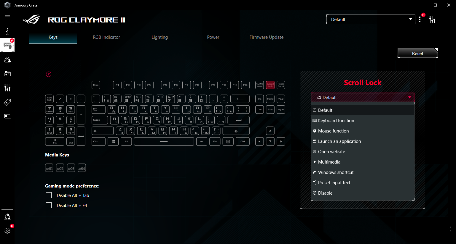 В качестве программного обеспечения ASUS ROG Claymore II использует приложение Armoury Crate с большим количеством требовательных к ресурсу процессов и лишних элементов. ПО требует загрузки и установки. Для настройки клавиатуры есть четыре вкладки. Первая отвечает за изменение назначения кнопок. Для этого доступны все клавиши кроме Fn (при использовании ПО, а при прямой записи с клавиатуры недоступны еще Caps Lock, Num Lock, Scroll Lock, Win, левый Alt). Назначить можно команды клавиатуры и мыши (только левой или правой кнопки), макрокоманды, запуск программ или открывание сайтов, мультимедийные и Windows команды, ввод определенного текста, полное отключение клавиши или возврат ее в состояние по умолчанию. Есть и кнопка сброса всего на начальные настройки. Также в игровом режиме, кроме кнопки Win, можно отключить комбинации Alt+Tab и Alt+F4. И назначить четыре дополнительных клавиши из цифрового блока.