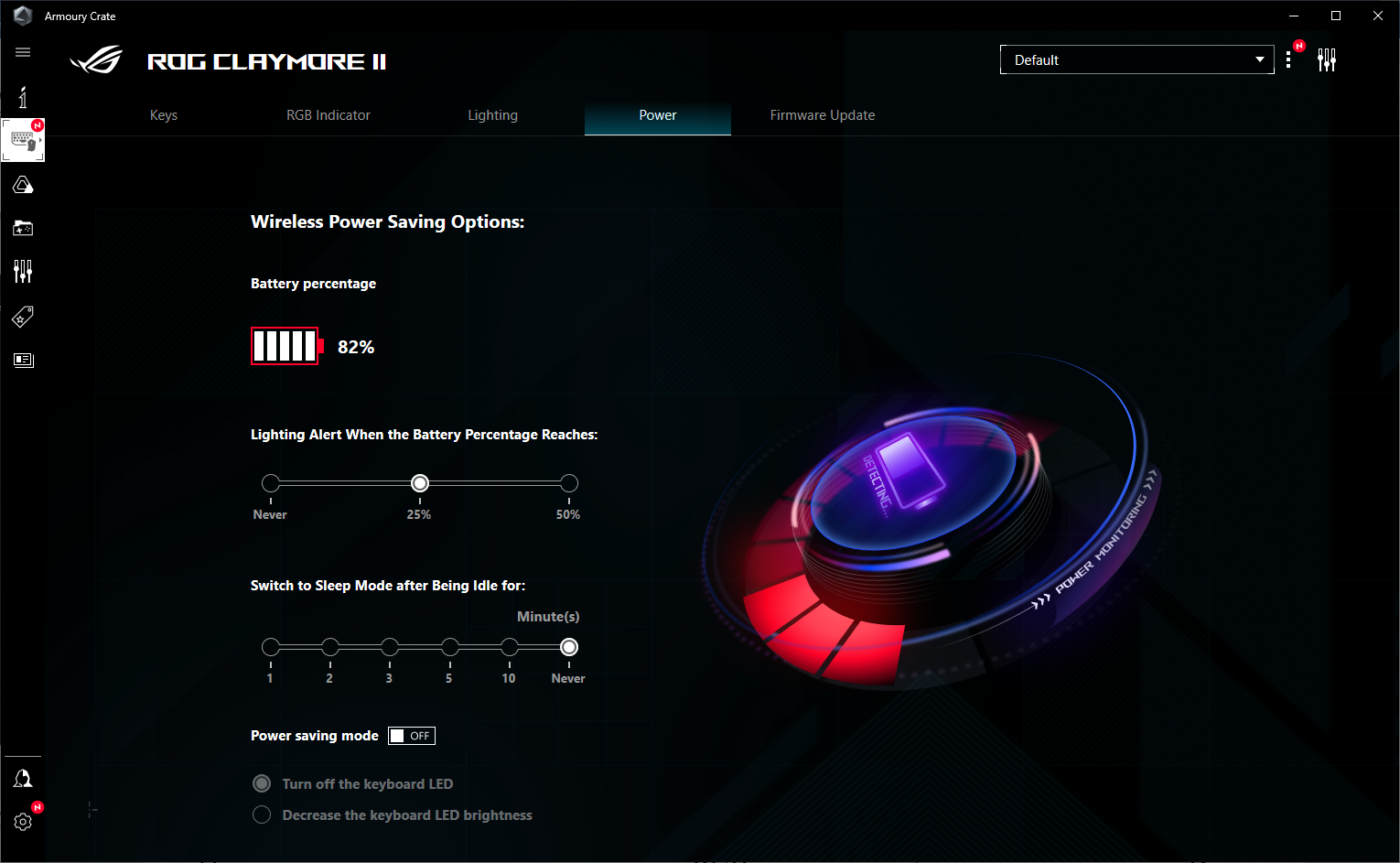 Отдельно существует вкладка для настройки RGB индикатора, встроенного в логотип. Ему можно задать два режима работы подсветки: 1) синхронизацию с подсветкой; 2) работу в качестве индикатора уровня заряда со своими отдельными цветами.