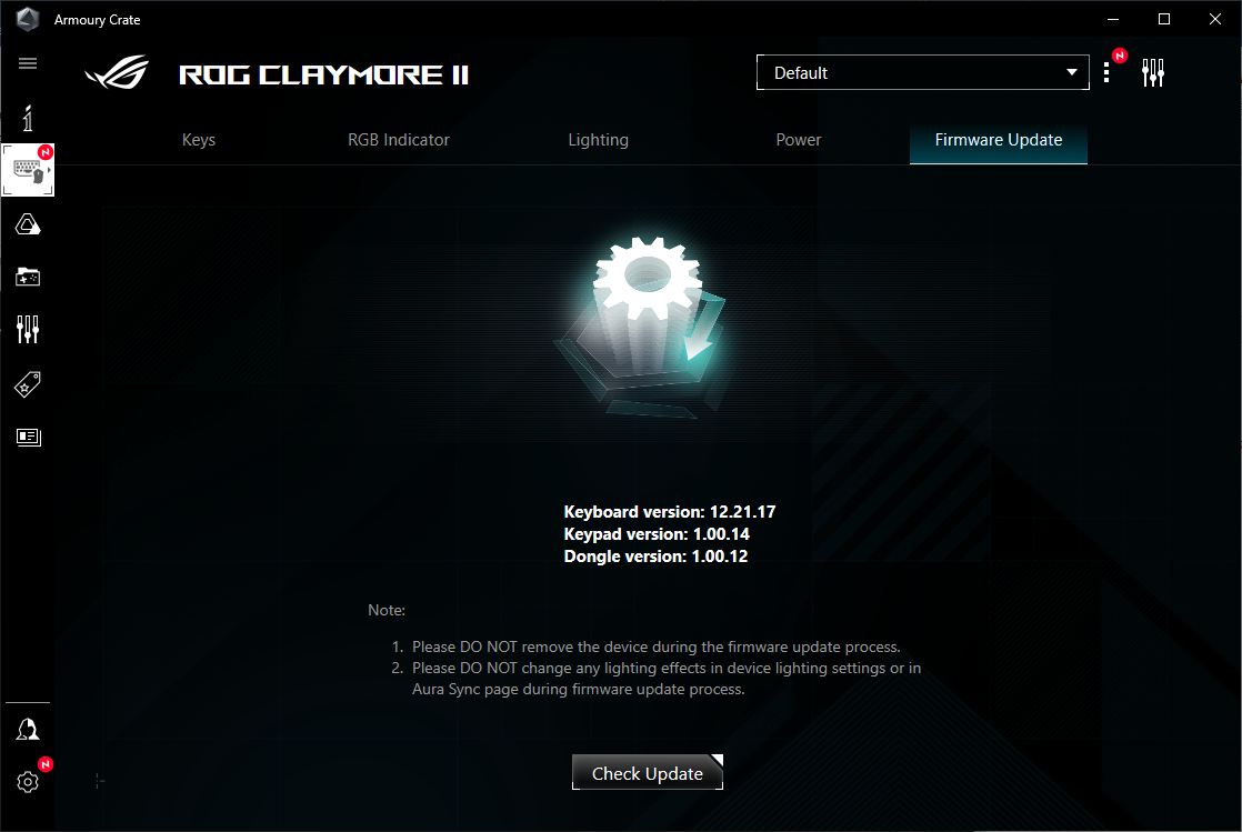 В разделе «Обновление прошивки» происходит проверка версии прошивки клавиатуры, цифрового блока и приемника и их обновления при необходимости. Актуальные версии микропрограмм при написании этого обзора видны на изображении.
