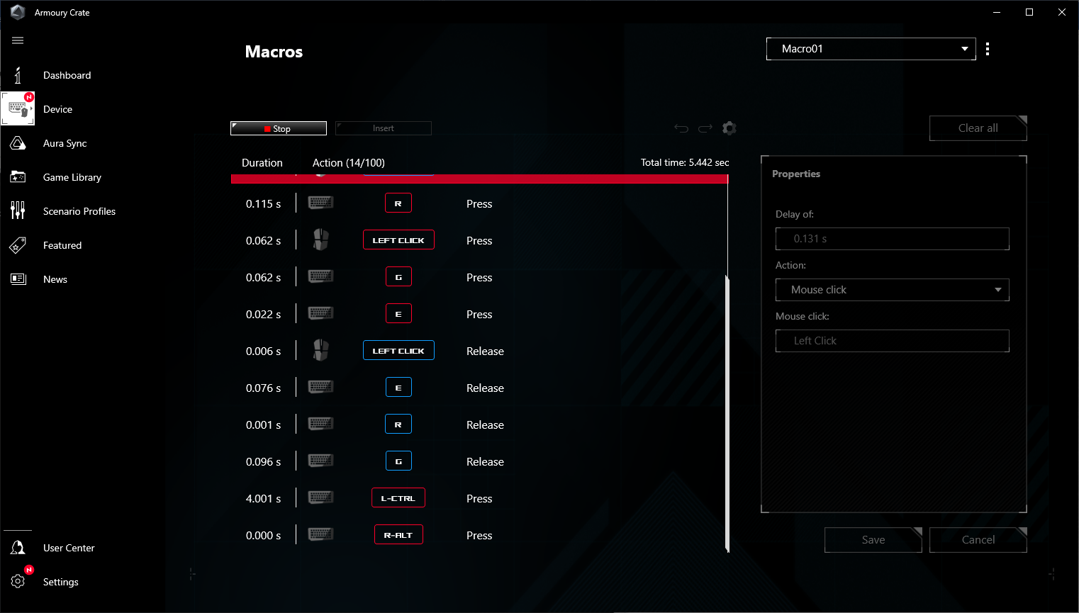 В редакторе макросов можно записывать команды с клавиатуры и мыши (в том числе направления прокрутки и дополнительные клавиши) с учетом временных задержек или без них. Потом все это можно отредактировать. Всего доступно 100 действий на одну цепочку команд, причем нажатие и отпускание клавиши являются отдельными действиями. Для команды можно настроить запись задержки как есть, фиксированную задержку или без нее. Воспроизведение есть в трех вариантах: постоянно по нажатию, постоянный повтор или один раз. Задержку записи можно установить на 1, 3 или 5 секунд. Всем макрокомандам можно присвоить собственное название, создавать и удалять их, импортировать или экспортировать.