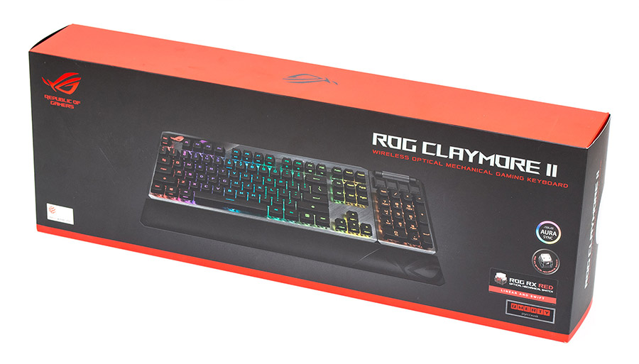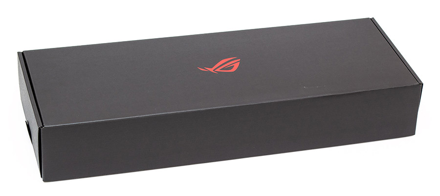 Клавиатура поставляется в красно-черной коробке, оформленной в фирменные цвета бренда ROG. На фронтальной и задней стороне отображен внешний вид продукта и вся необходимая информация о нем.
