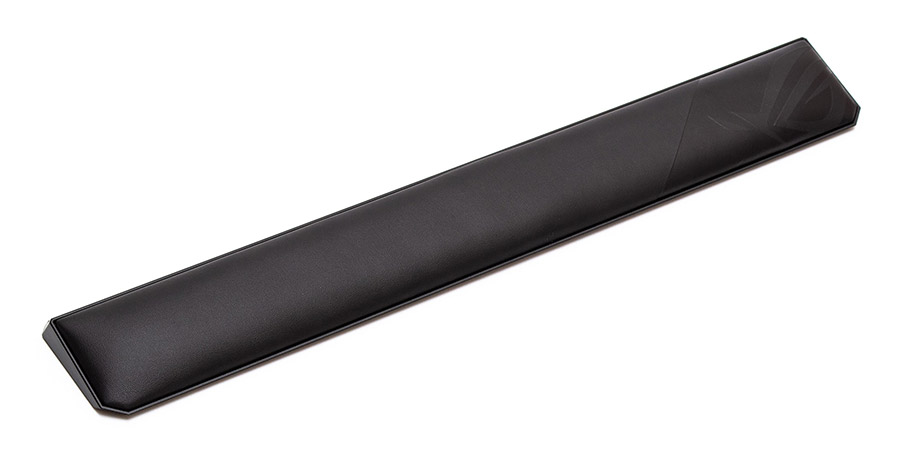 Съемная магнитная подставка под ладони имеет размер 454х70х16 мм. Сверху она покрыта мягкой искусственной кожей с тисненым логотипом ROG с правой стороны. Нижняя часть выполнена из пластика. Здесь есть две большие резиновые ножки посередине и четыре треугольных ножки по углам подошвы. Пять магнитов равномерно распределены внутри вдоль края задней грани подставки. Также снизу есть еще один логотип и надпись ROG. Вес подставки — 194 г.