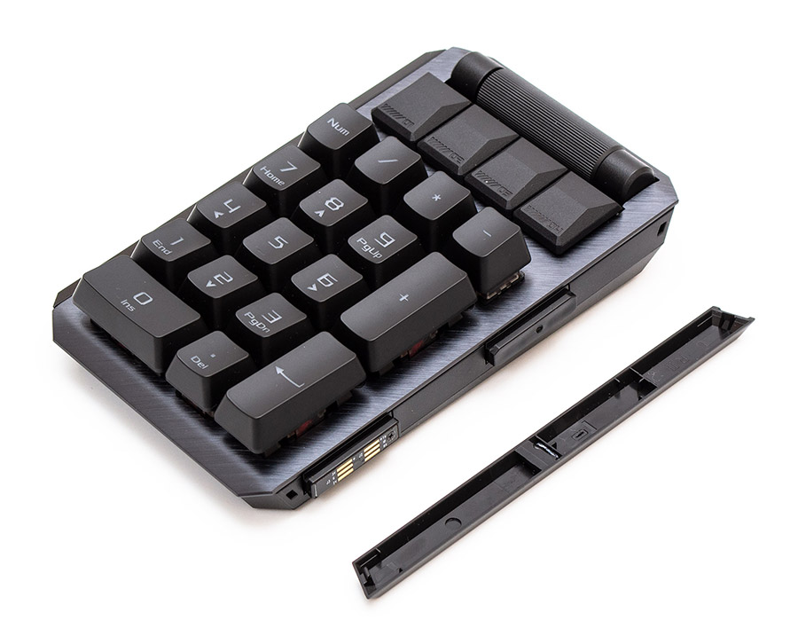 | Особенности | Съемный блок цифровых клавиш с четырьмя дополнительными кнопками и регулировкой громкости звука, который можно закрепить справа или слева от клавиатуры. Возможность работы в проводном и беспроводном режиме. Отдельный индикатор заряда. Быстрая зарядка. Быстрая аппаратная запись макрокоманд без ПО. Съемный кабель USB Type-C. Сквозной порт USB. Съемная магнитная подставка под ладони. |