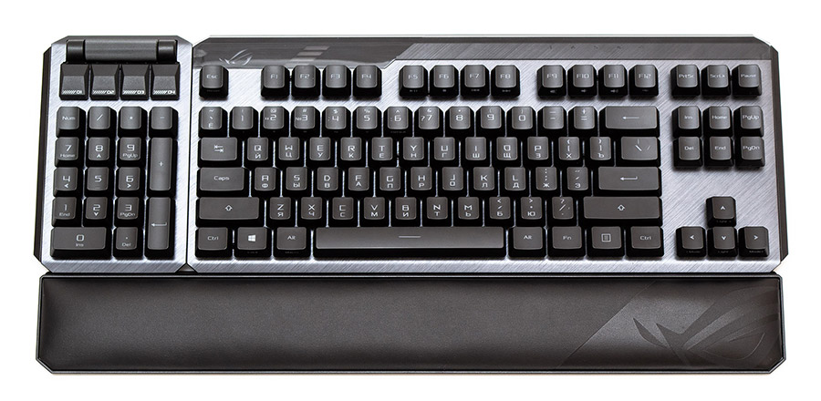 ASUS ROG Claymore II является модульным устройством и состоит из двух отдельных частей — самой клавиатуры TKL формата и цифрового блока, который можно подключить как с правой, так и с левой стороны. Кроме того, в комплекте появилась мягкая полноформатная подставка под ладони. Рассмотрим их поочередно.
