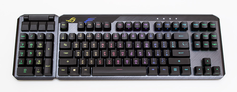 Раскладка клавиш здесь в целом стандартная и не требует привыкания. Хотя все равно нужно время на адаптацию, чтобы не попадать по цифровому блоку, когда он закреплен слева. Используемые здесь переключатели ROG RX Red предназначены именно для игр. Эти оптические механизмы очень быстры и консистентны в плане срабатывания, прекрасно стабилизированы и во многом напоминают ощущение от мембранной клавиатуры, но со всеми механическими преимуществами. Для тех, кто ищет клавиатуру для печати больших объемов текста, они могут не понравиться по тактильным ощущениям. Поэтому им лучше будет смотреть в сторону RX Blue или классических механических переключателей.
