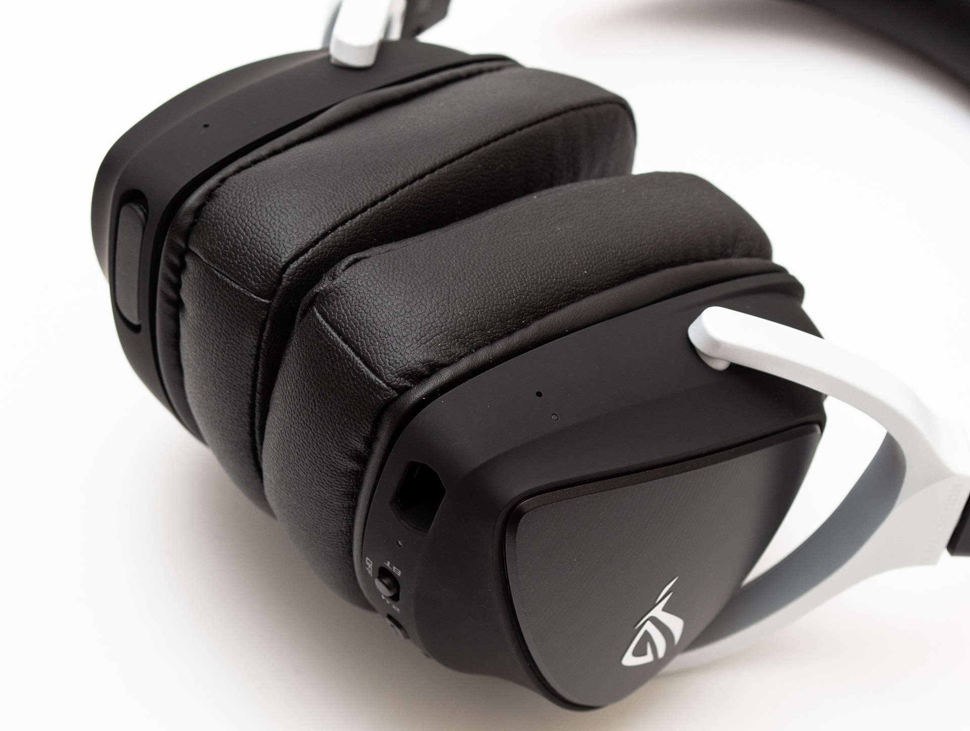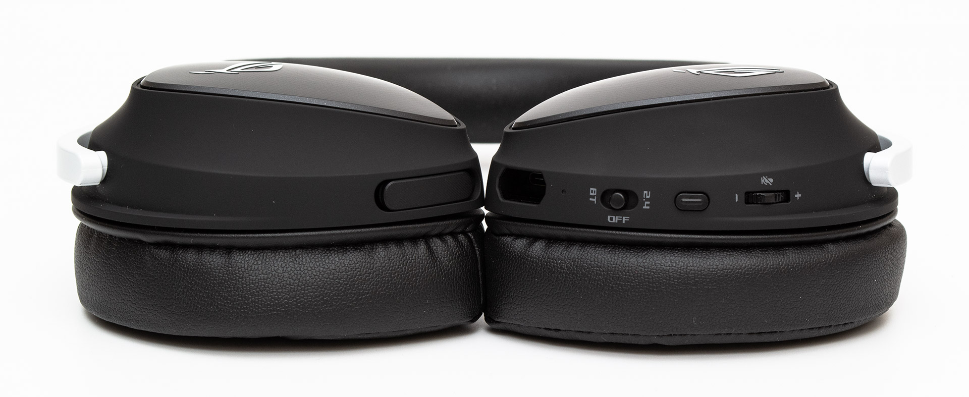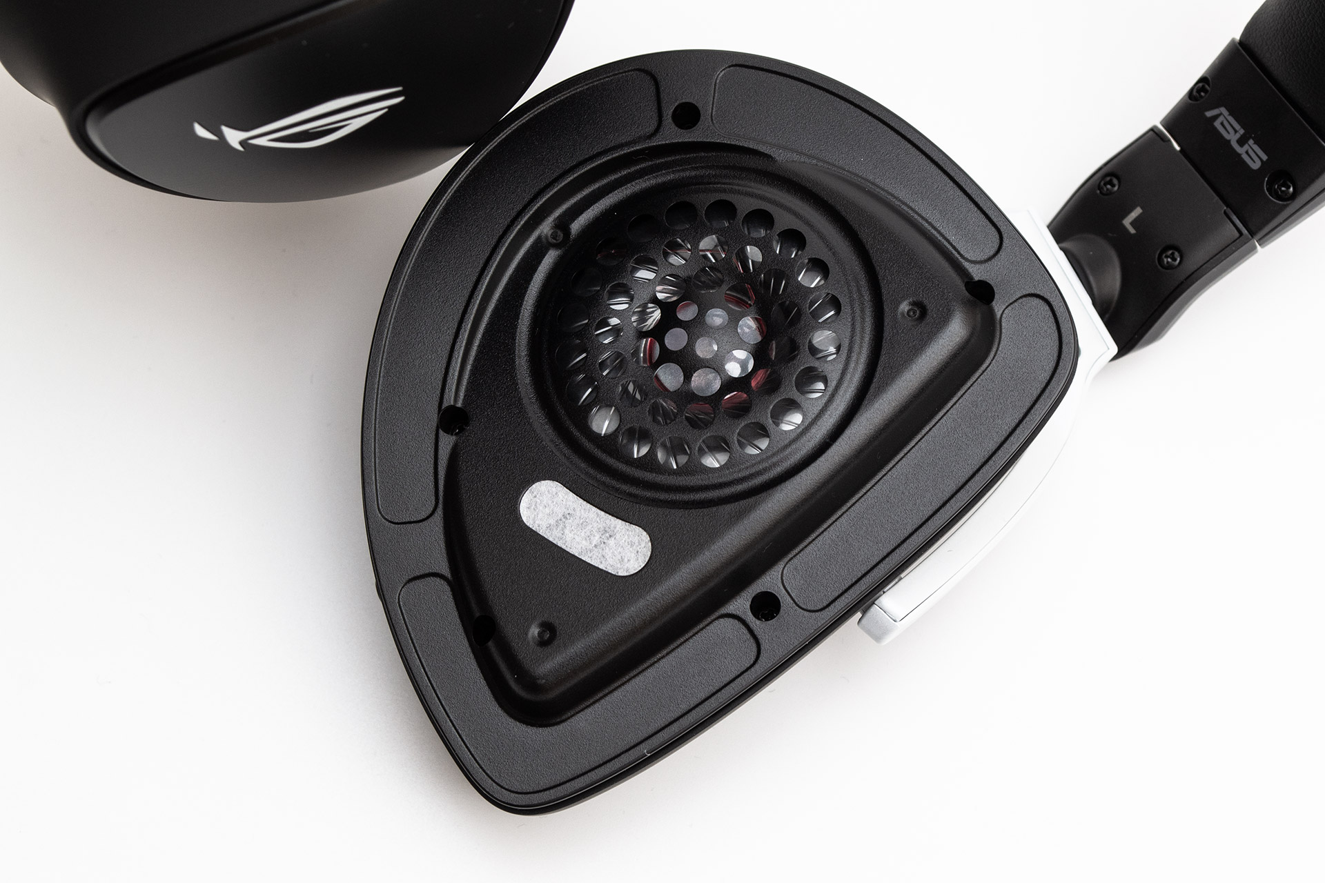 D-образные чаши наушников не зря имеют такую форму. По мнению дизайнеров, она лучше повторяет форму ушей и на 20% уменьшает площадь контакта амбушюр с кожей. На внешней стороне чашек есть вставка под металл в виде закругленного треугольника, поверх которой нанесен белый логотип ROG в виде стилизованного глаза. Боковины выполнены из пластика с покрытием софт-тач. Стоковые амбушюры выполнены из искусственной кожи. Внутри них, на защитной сетке, видны еще одни логотипы. По желанию амбушюры можно заменить тканевыми, которые также имеются в комплекте.