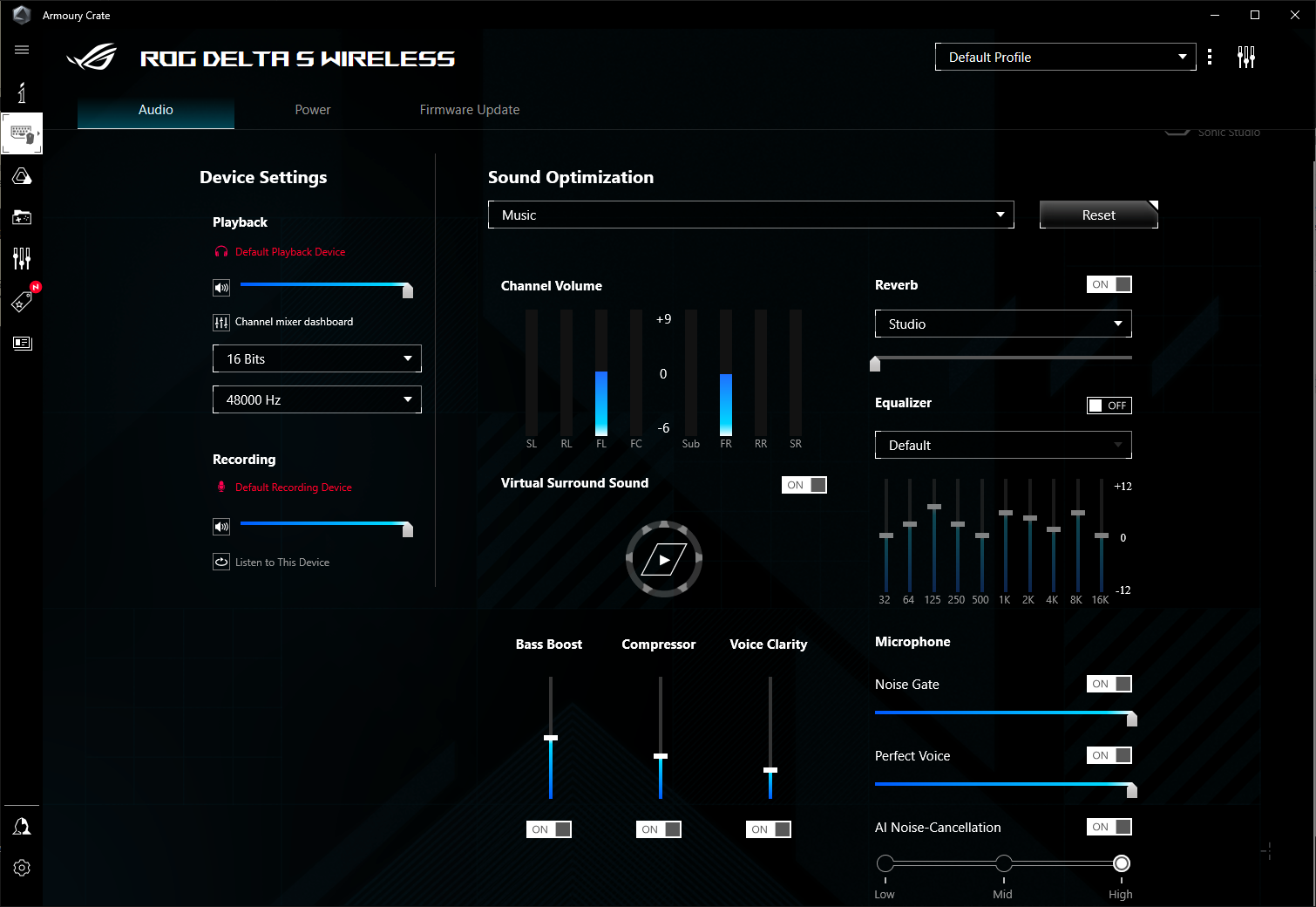 В качестве программного обеспечения ROG Delta S Wireless использует комплекс ASUS Armoury Crate. Все настройки аудио собраны на одной большой вкладке, открывающейся первой при обращении к устройству. Возможно, отрегулировать практически каждый параметр звучания динамиков и микрофона. Большинство настроек интуитивно будут понятны каждому, кто хотя бы отдаленно имеет отношение к звуку или музыке.
