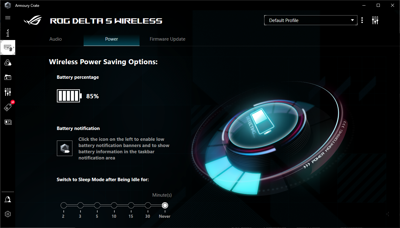ASUS ROG Delta S Wireless — это, в первую очередь, игровая гарнитура. Поэтому не стоит от нее ждать чистоты звука на уровне хороших проводных наушников для аудиофилов. Но и для прослушивания музыки она вполне подходит. 50-мм динамики с закрытыми акустическими камерами обладают достаточным запасом мощности и неплохим качеством. На минимальном уровне громкости детали звука не теряются. А на максимальном нет гудения или щелчков динамиков. Частотный диапазон сбалансирован, без ярко выраженных низов или верхов. Если требуется другие настройки, к услугам пользователя есть программное обеспечение с эквалайзером и разными сценариями звуковой сцены. В целом качество звучания в играх, фильмах, музыке и воспроизведении голоса хорошее. Оптимальный уровень громкости, чтобы не наносить вред ушам находится в районе 60%. По позиционированию виртуального пространственного звука 7.1 все также хорошо, хотя позиционирование источника звука сзади недостаточно выражено, как на мой вкус. В целом, беспроводной звук работает стабильно, без отпадения и пауз. Если при воспроизведении потоковой музыки иногда происходят щелчки, попробуйте переместить передатчик чуть поодаль других беспроводных источников. Помехи от Wi-Fi роутера вполне возможны.