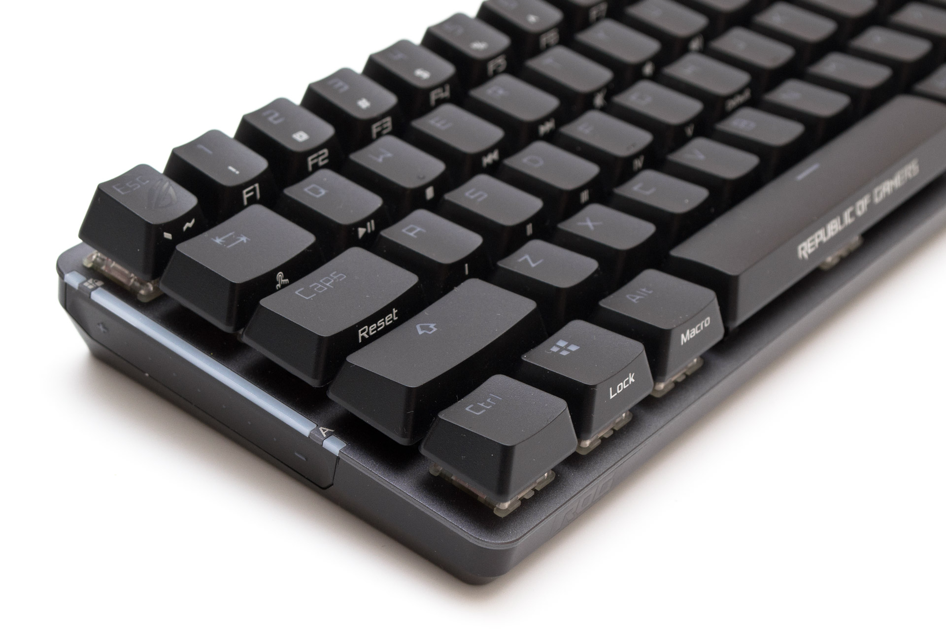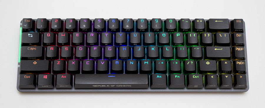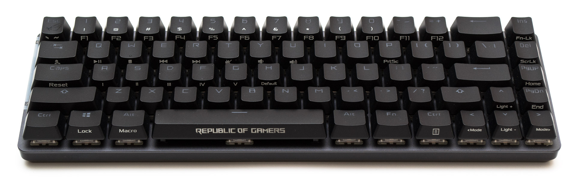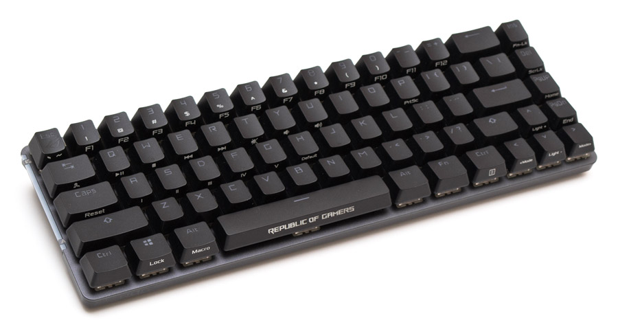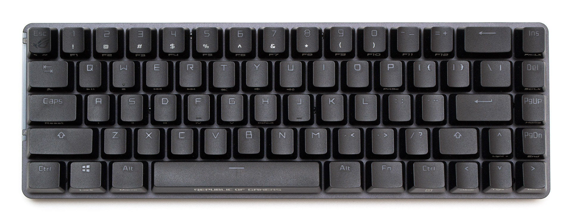 Дизайн у ASUS ROG Falchion простой, сдержанный и минималистичный. Габариты практически совпадают с размерами печатного блока клавиш, сделанного в стиле «скелетон». Под ними находится металлическая опорная панель толщиной в 1 мм. Раскладка кнопок базируется на видоизмененном ANSI-стандарте с длинным левым Shift и однорядным Enter. Нет отдельных функциональных клавиш, редакторские кнопки и стрелочки максимально ужаты под правую сторону клавиатуры. Есть исключительно латинские символы, вытесненные в колпачках из PBT пластика путем двойного литья под давлением. Она находятся в центральной верхней части кнопок. Пробел укорочен, благодаря чему правые Alt, Fn, Ctrl смещены в левую сторону. В общем, с одной стороны получилось максимально компактно, с другой — все нужные кнопки всегда под рукой.