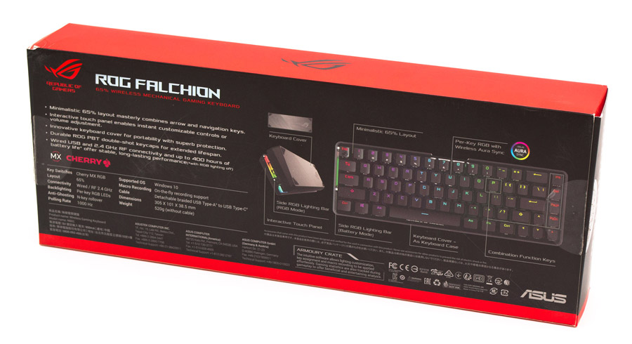 Давайте попробуем коротко перечислить основные особенности ASUS ROG Falchion. Это механическая «скелетон»-клавиатура с переключателями Cherry, формата 65% (68 клавиш, включая стрелочки, Del, Ins, PgUp, PgDn), колпачками клавиш из PBT и RGB-подсветкой. Из «экзотических» моментов стоит отметить, что клавиатура беспроводная (может работать и заряжаться по кабелю), и у неё есть сенсорная панель со встроенной индикацией. И красивая защитная накладка в придачу. А теперь попробуем изучить данное устройство подробнее.