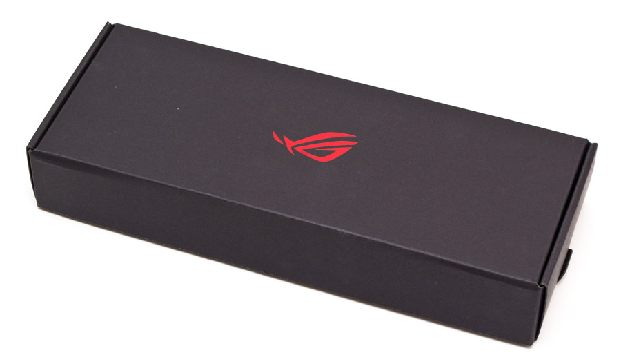 Внутри находится черная коробка из плотного картона с красным логотипом ROG посередине. Защиты от повреждений в ней практически нет, только накладка из ткани и картонные вставки по кругу.