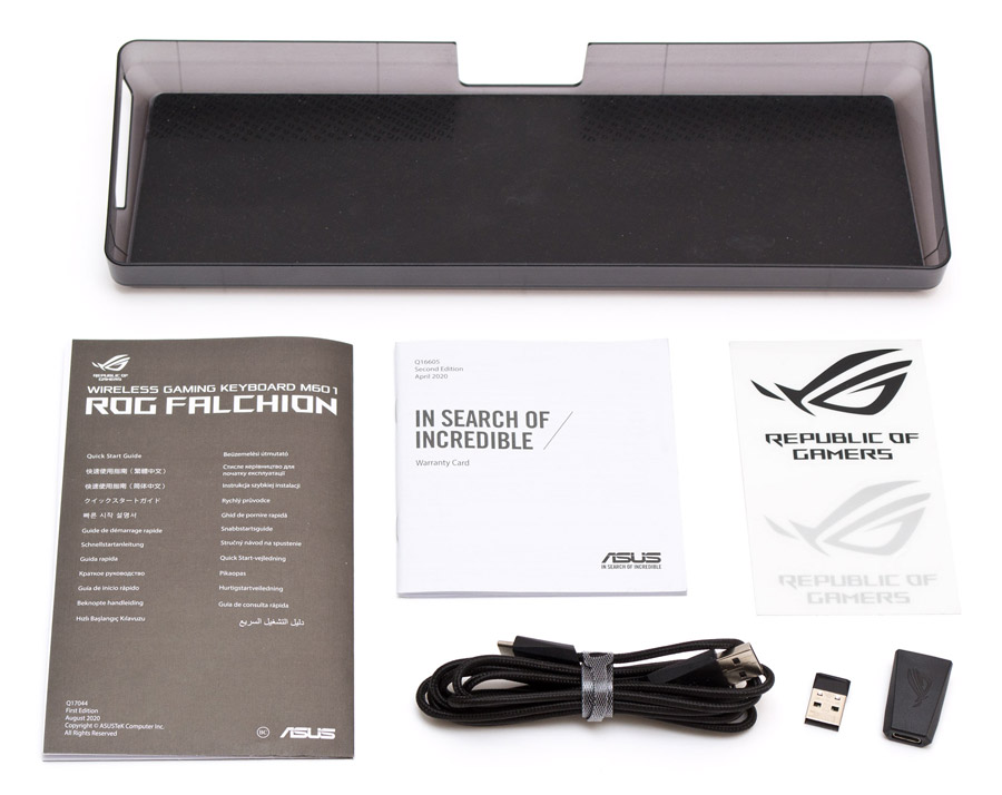 В комплекте поставки есть поликарбонатная крышка-подставка, инструкция по использованию, лист с информацией о гарантии, пара наклеек с логотипом ROG, кабель c USB Type-C с одной стороны и USB Type-A с другой, приемник и переходник.