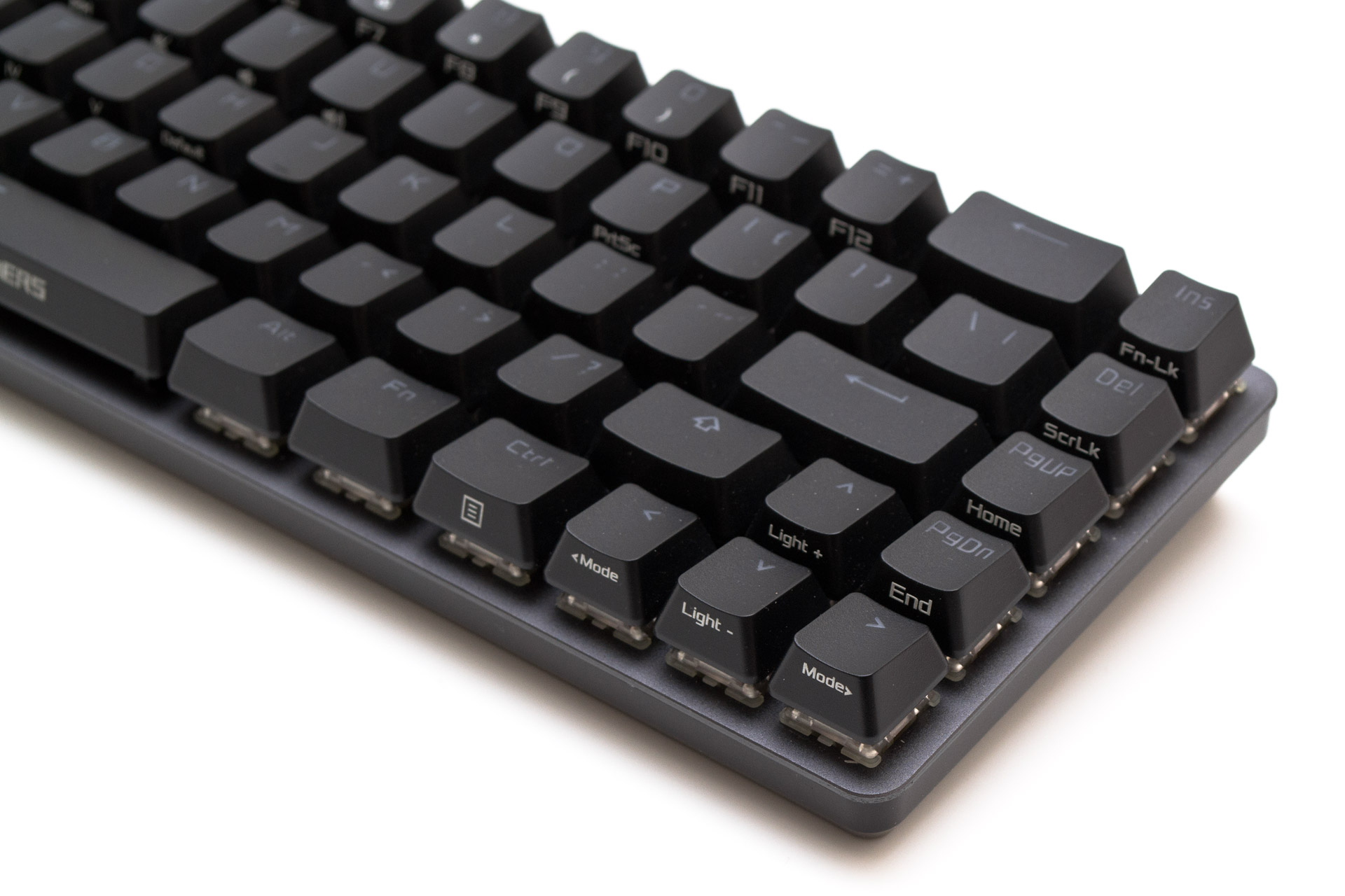 По части эргономики печати все достаточно хорошо. Зауженные клавиши с правой стороны потребуют некоторого времени на адаптацию, но это не критично и привычка нарабатывается быстро. В целом стандартная раскладка позволяют печатать «вслепую» практически сходу. Классические красные переключатели Cherry в сочетании с колпачками клавиш из PBT создают отличные тактильные ощущения. Пожаловаться можно, разве что, на привычную уже «расхлябанность» пробела, но, к сожалению, так сейчас обстоят дела у большинства массовых клавиатур. Да и некоторые клавиши стоит переставить местами, но это уже дело личных предпочтений.