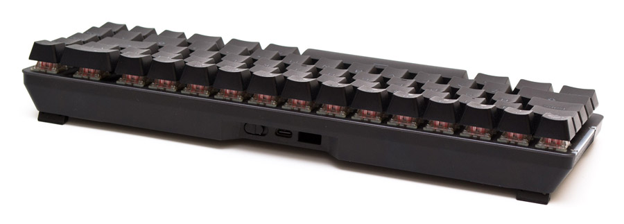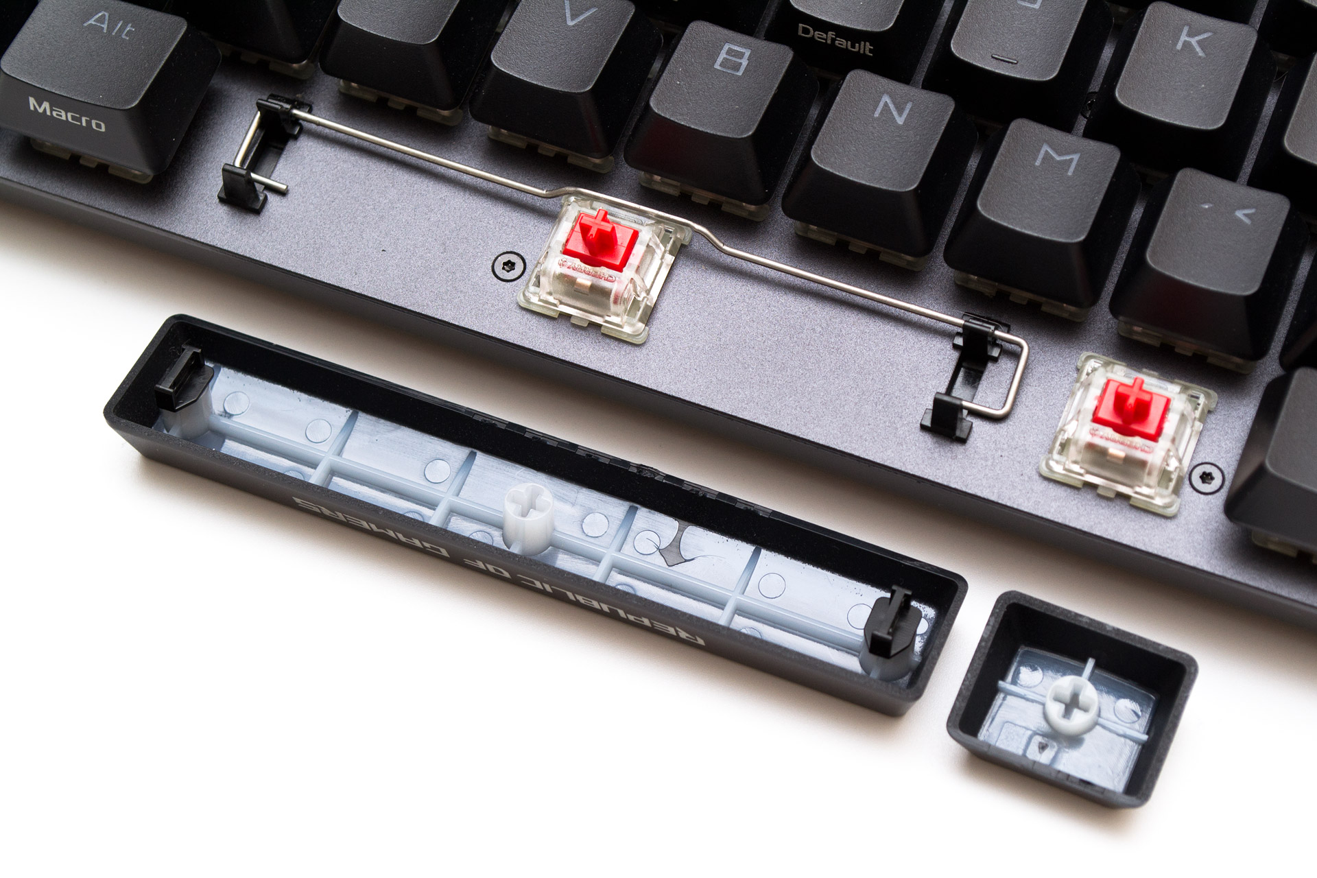 В качестве переключателей тут используются старые добрые и проверенные временем Cherry MX Red RGB в прозрачном корпусе (причем еще и немецкого производства, по утверждению компании). Вряд ли про них можно сказать что-то новое, кроме того, что это одни из самых уважаемых и надежных механизмов на рынке. А так все привычно — 4 мм полного хода, 2 мм до срабатывания, полностью линейный характер нажатия, 45 грамм усилия для активации и 50 млн. нажатий заявленного ресурса наработки на отказ. Не уверен, будет ли такое в продажу у нас, но на официальном сайте заявлены коричневые, синие и серебристые переключатели с другим характером тактильных ощущений в качестве альтернативы. Стабилизаторы тут внешние и на большинстве длинных клавиш они обеспечивают ровное нажатие, не считая слегка танцующего в горизонтальной плоскости пробела.
